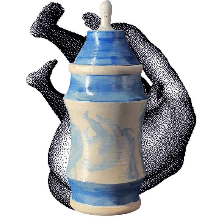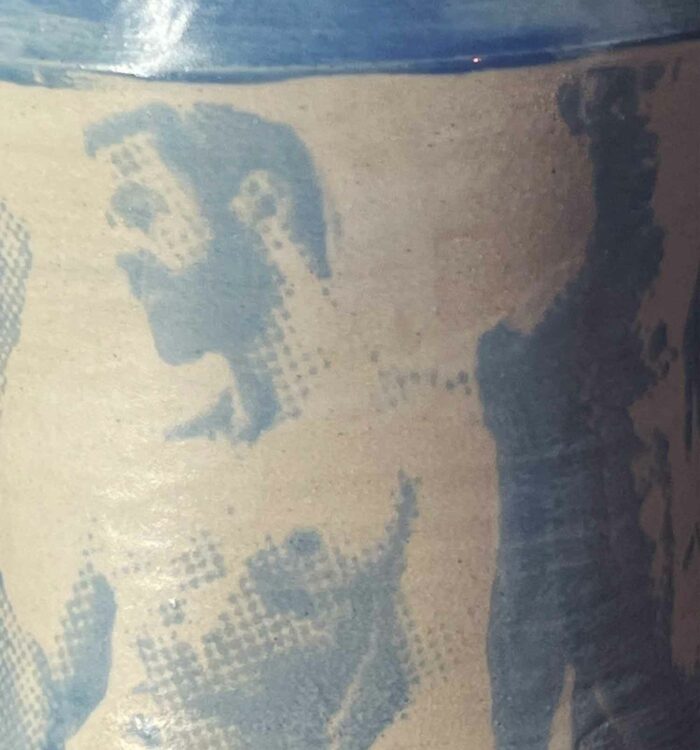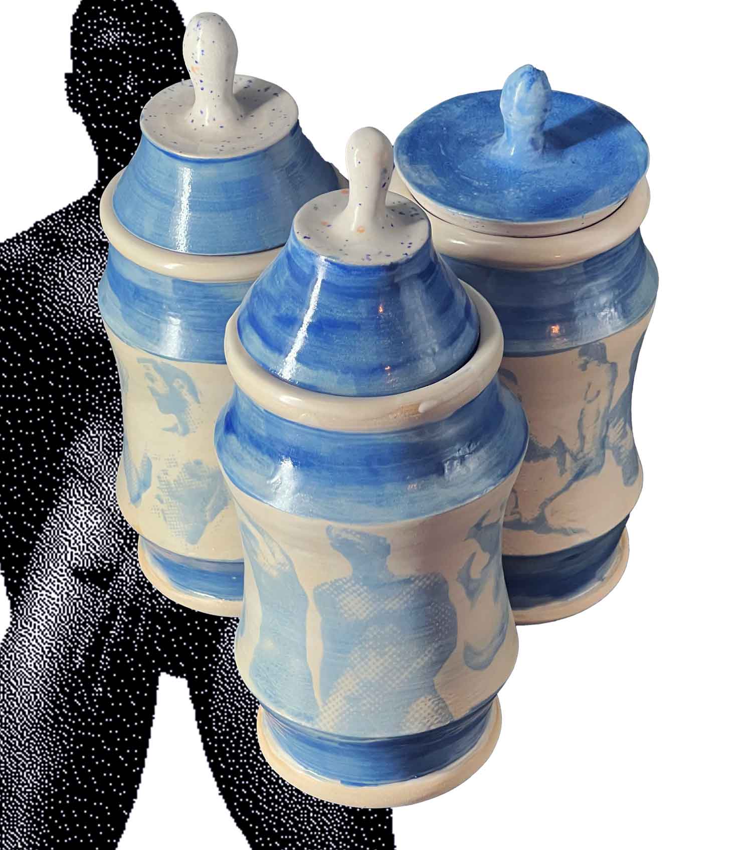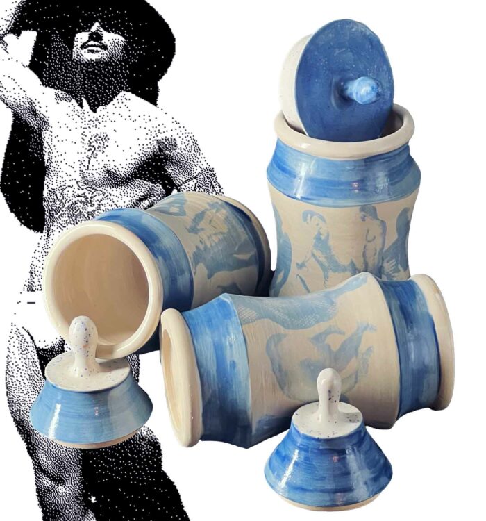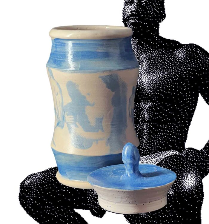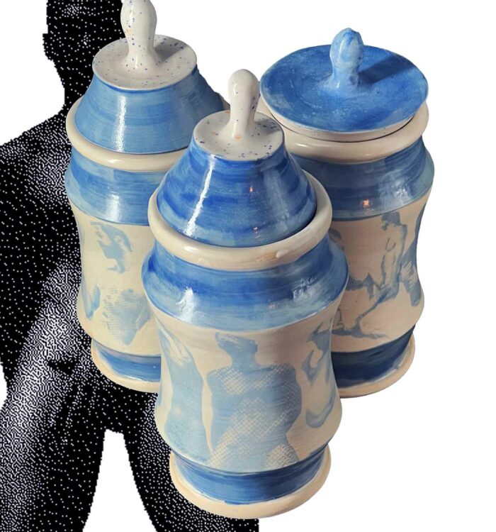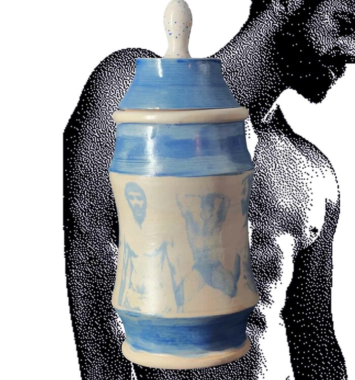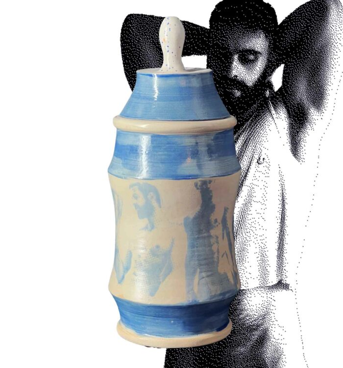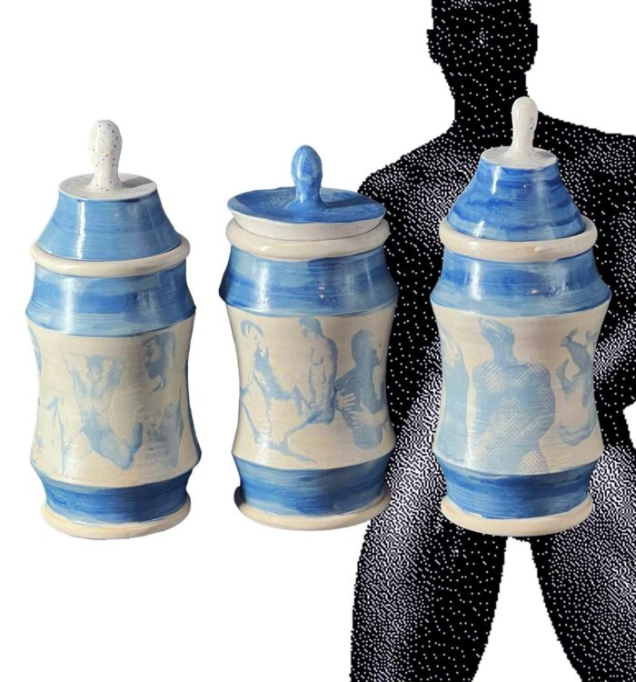 Trois silhouettes de terre qui se dressent entre forme utilitaire et confession érotique, couvertes d’une couverte brillante qui laisse paraître, en empreinte subtile, des figures masculines imprimées à l’engobe bleu, nus, estompés comme des fantômes de désir. Chaque albaril (version masculine des albarelles) évoque un jeu de clair-obscur, souvenir d’un regard, de corps, d’une présence qui s’efface tout en restant gravée dans la matière.