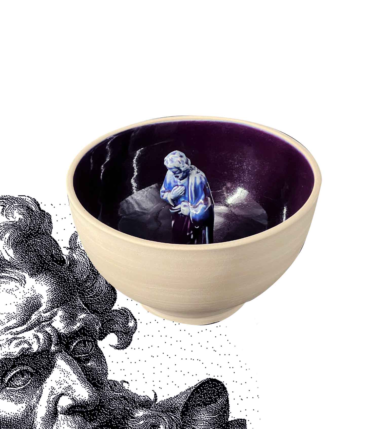 Façonné à la main, le bol porte les traces du geste. Objet du matin ou de contemplation, il mêle humour et tendresse, sacré et profane.