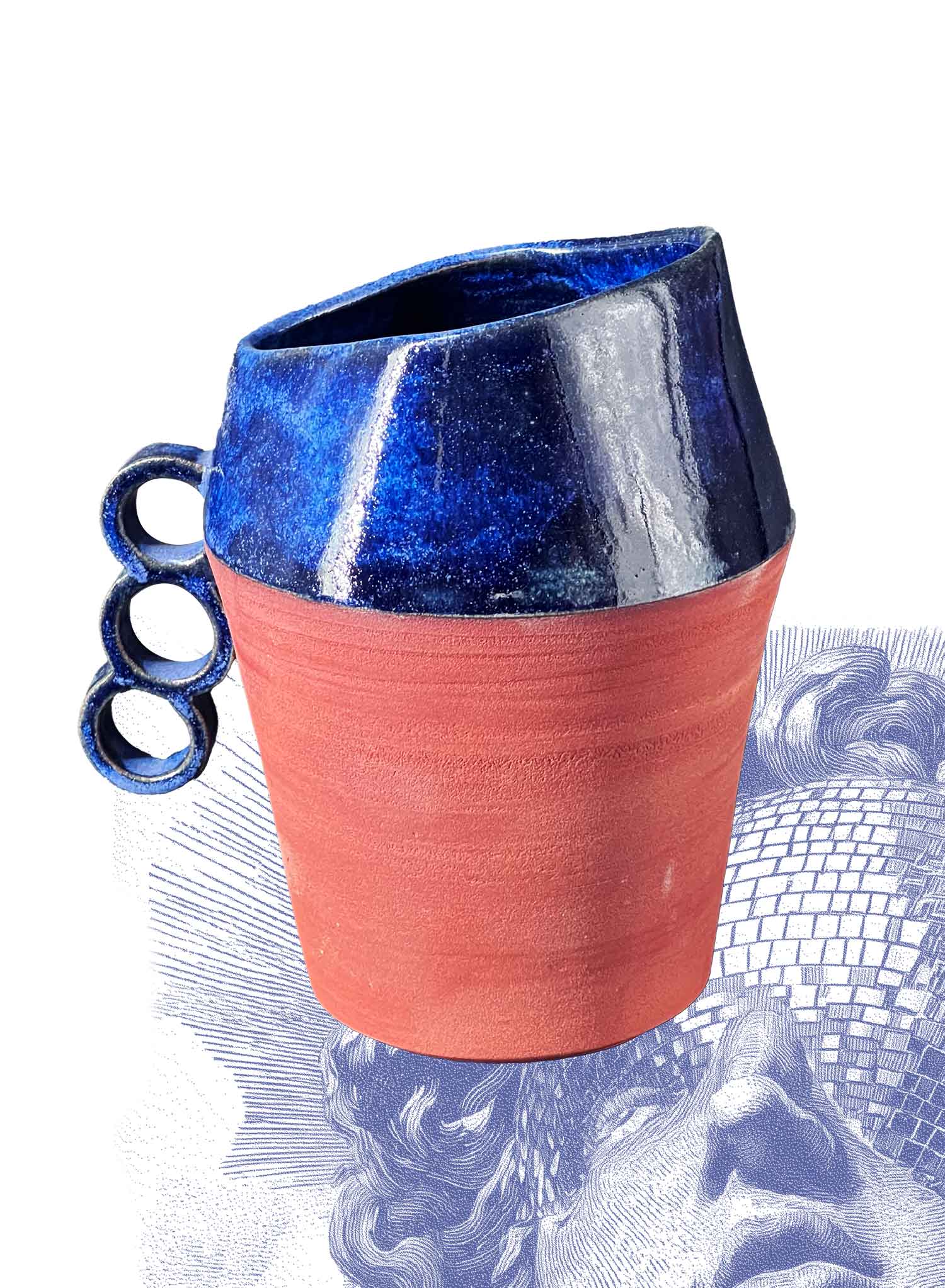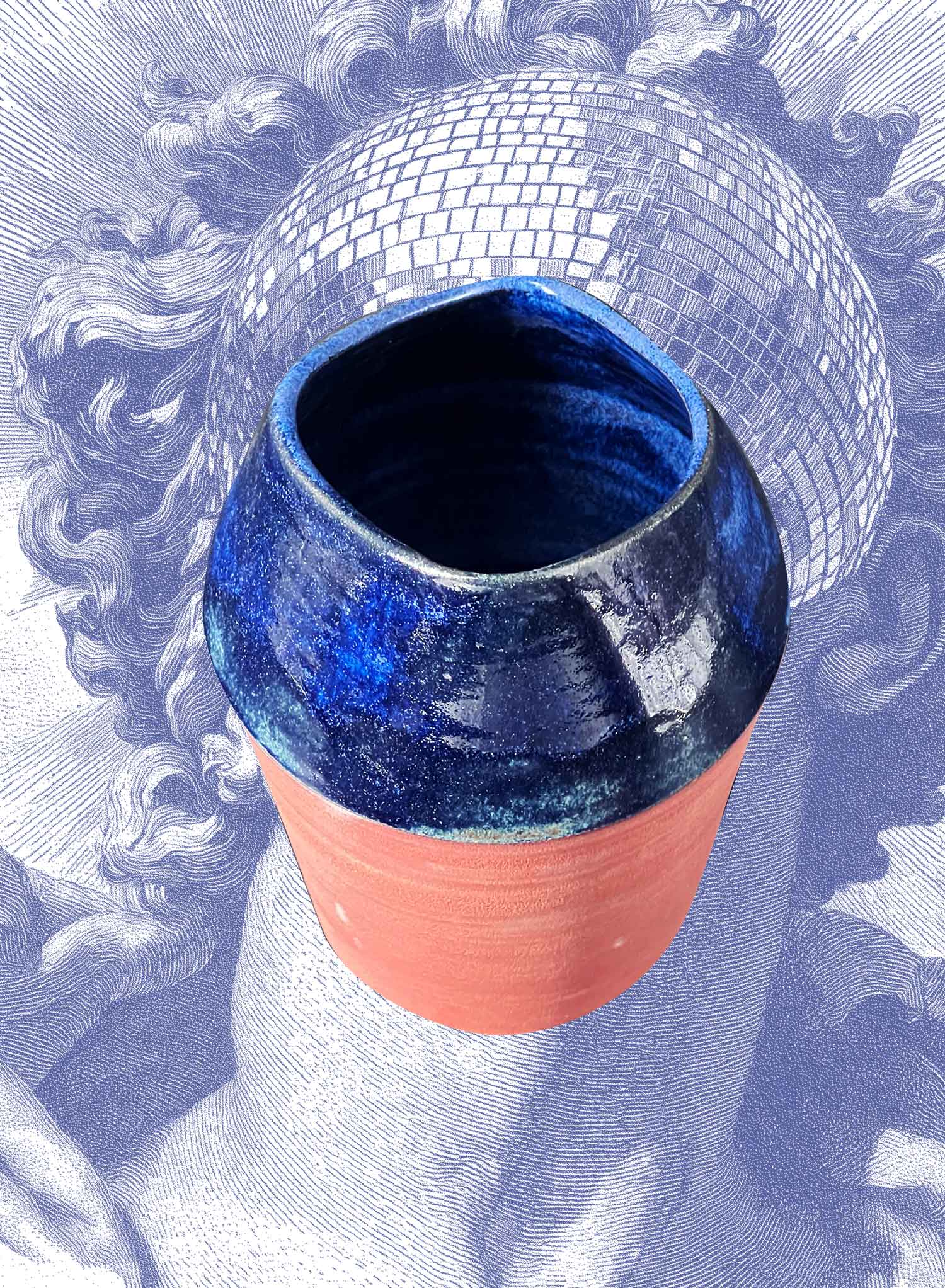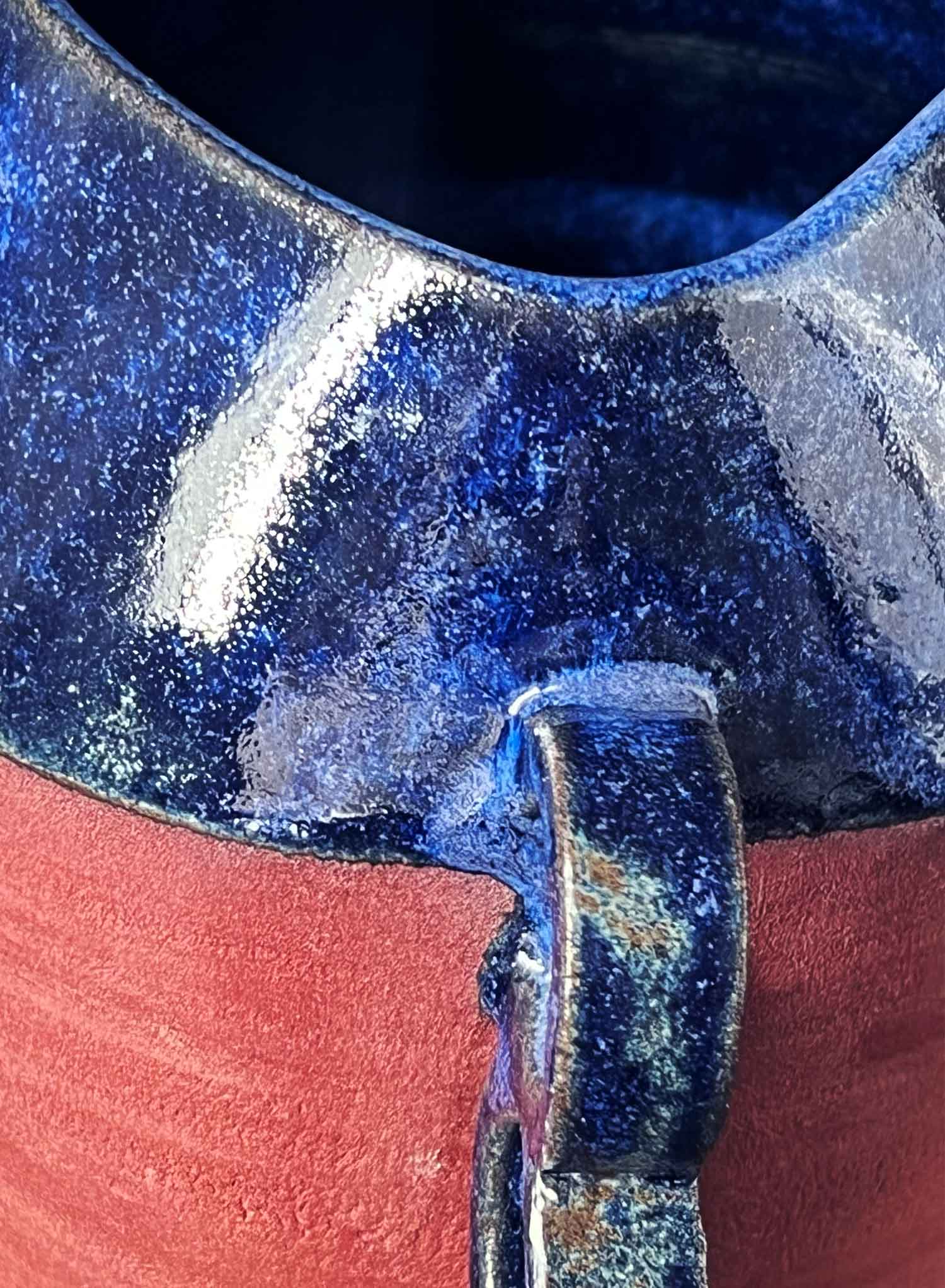 La Carafe Bleu des Abysses se distingue par sa moitié supérieure couverte d’un émail bleu à effets, évocations d’écume en contraste avec la terre rouge brute.