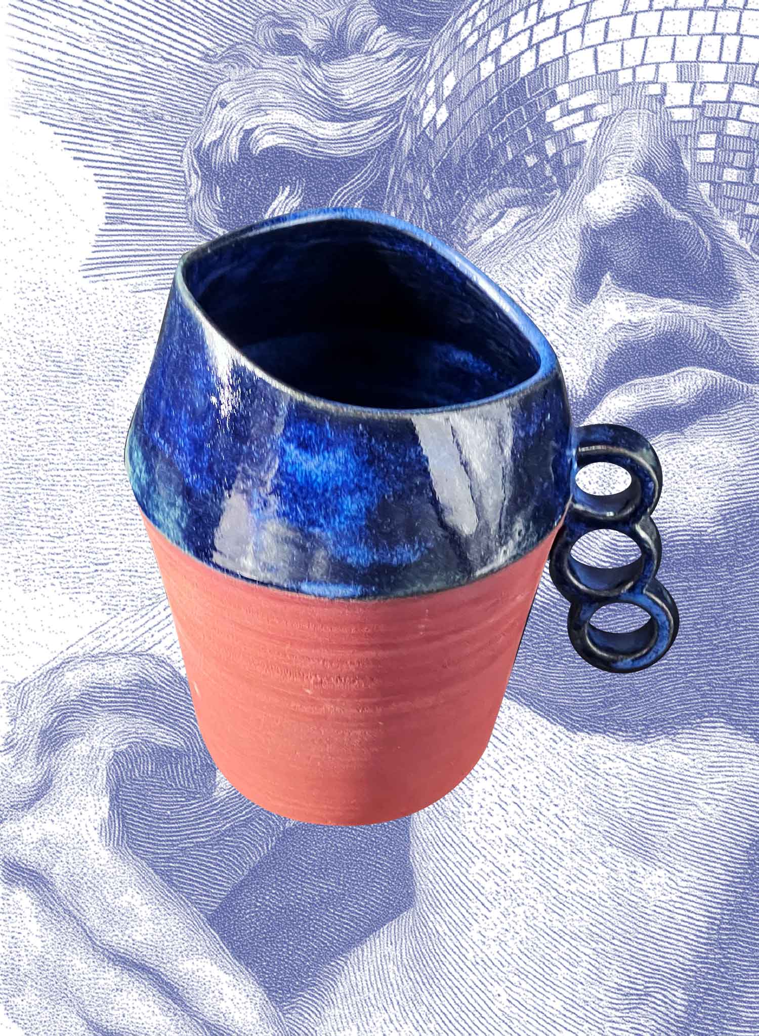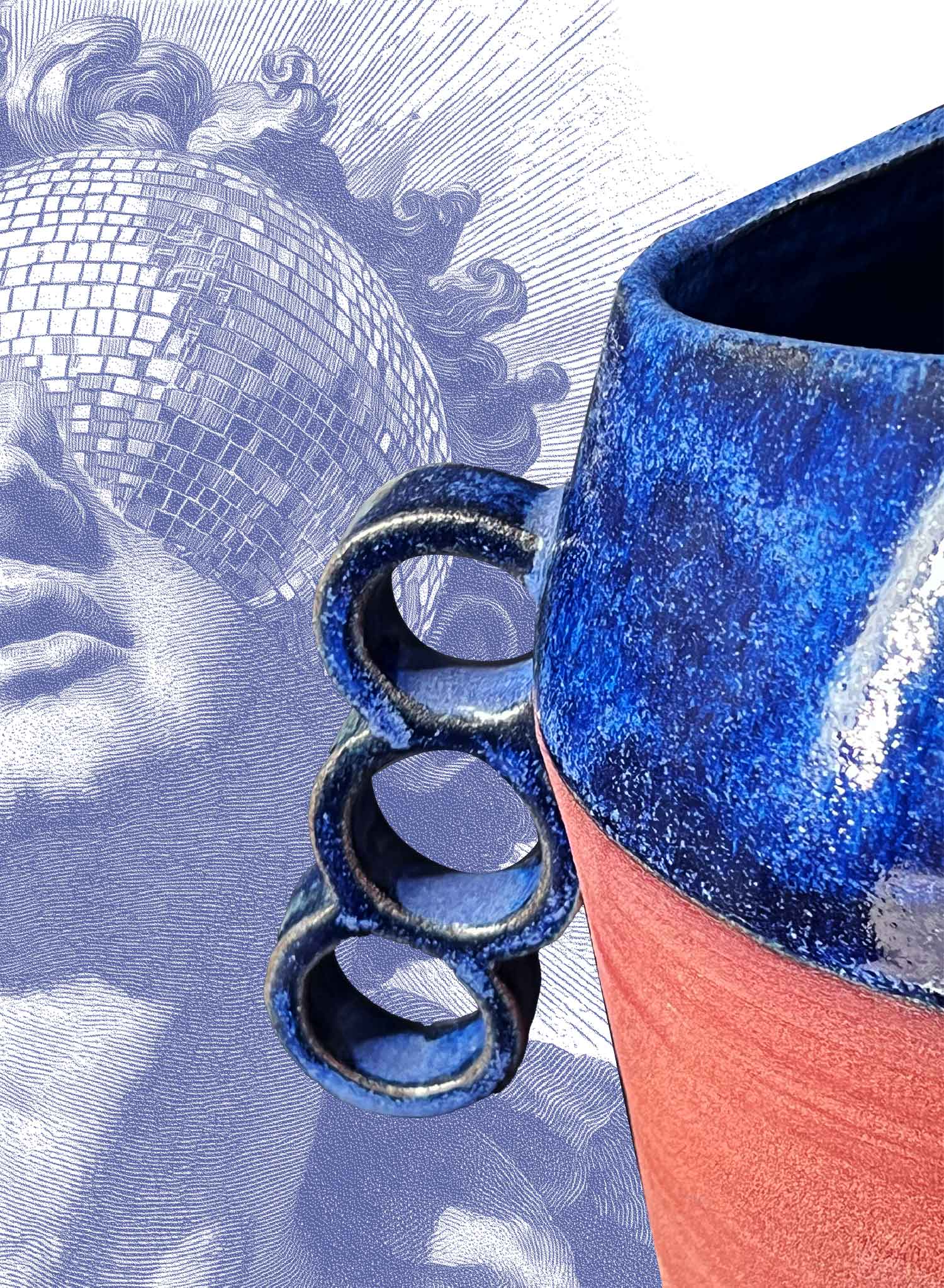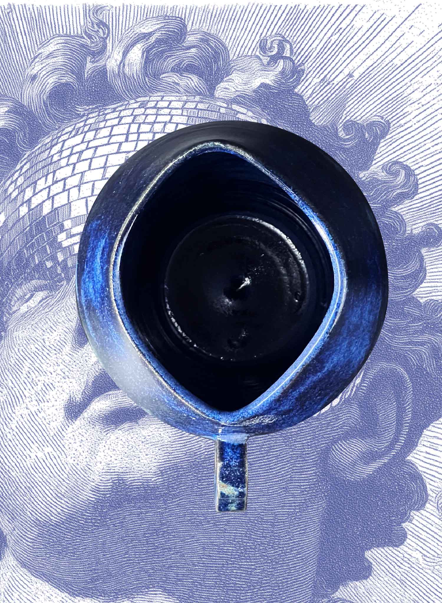 Bleu vibrant, terre brute, poignée affirmée — une carafe qui verse autant qu’elle s’impose.