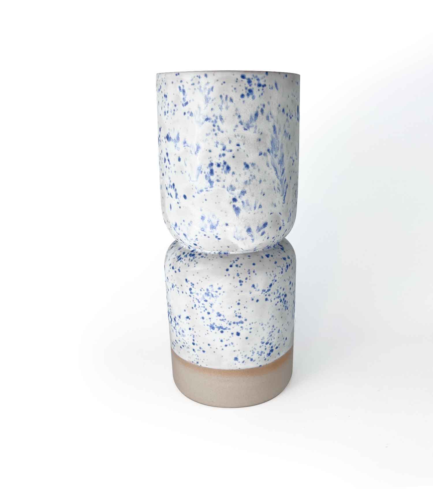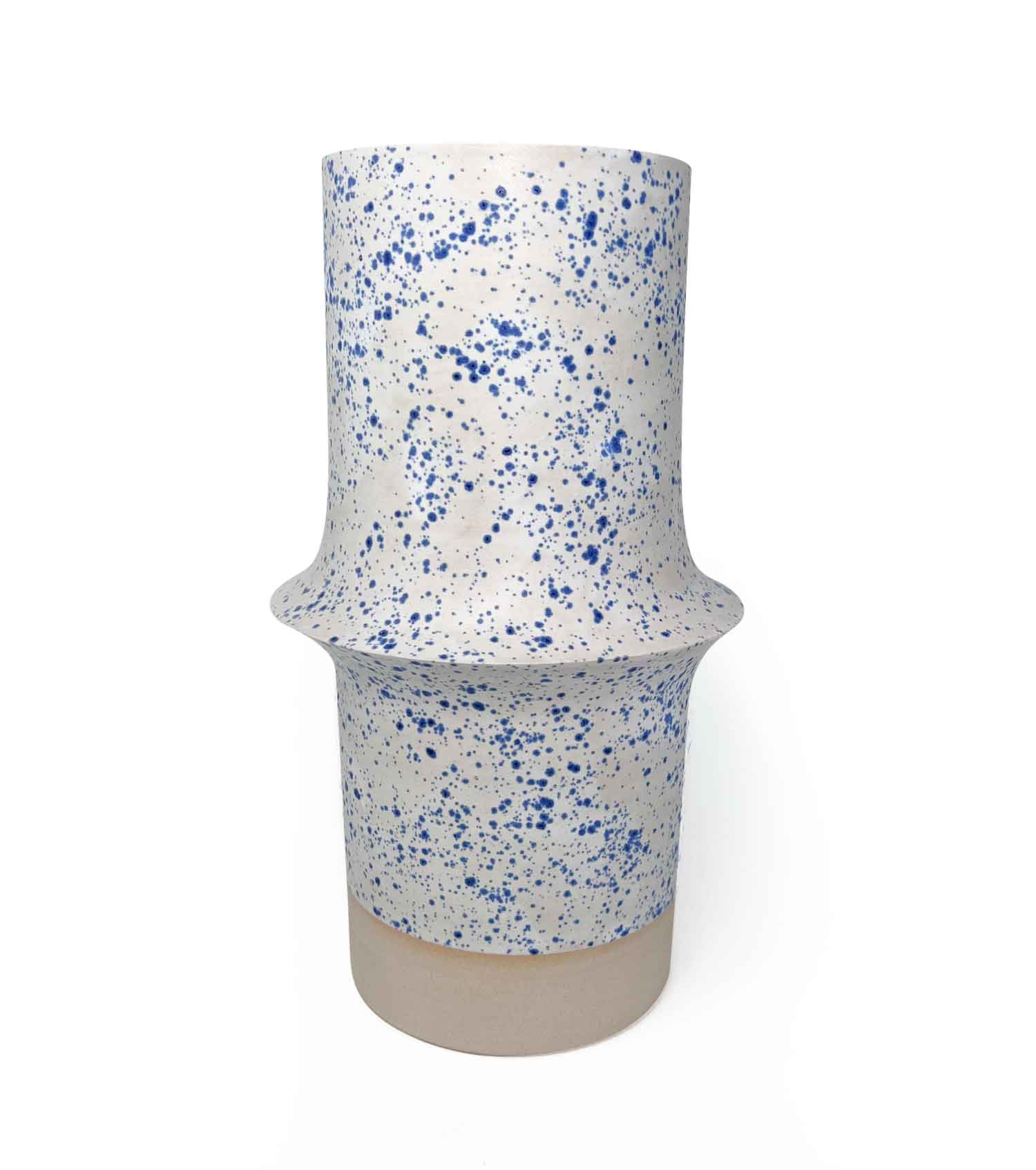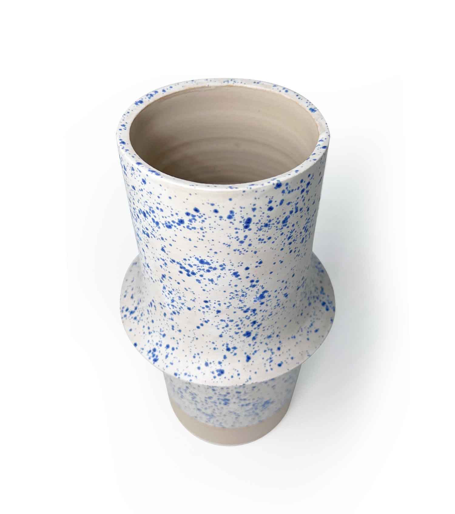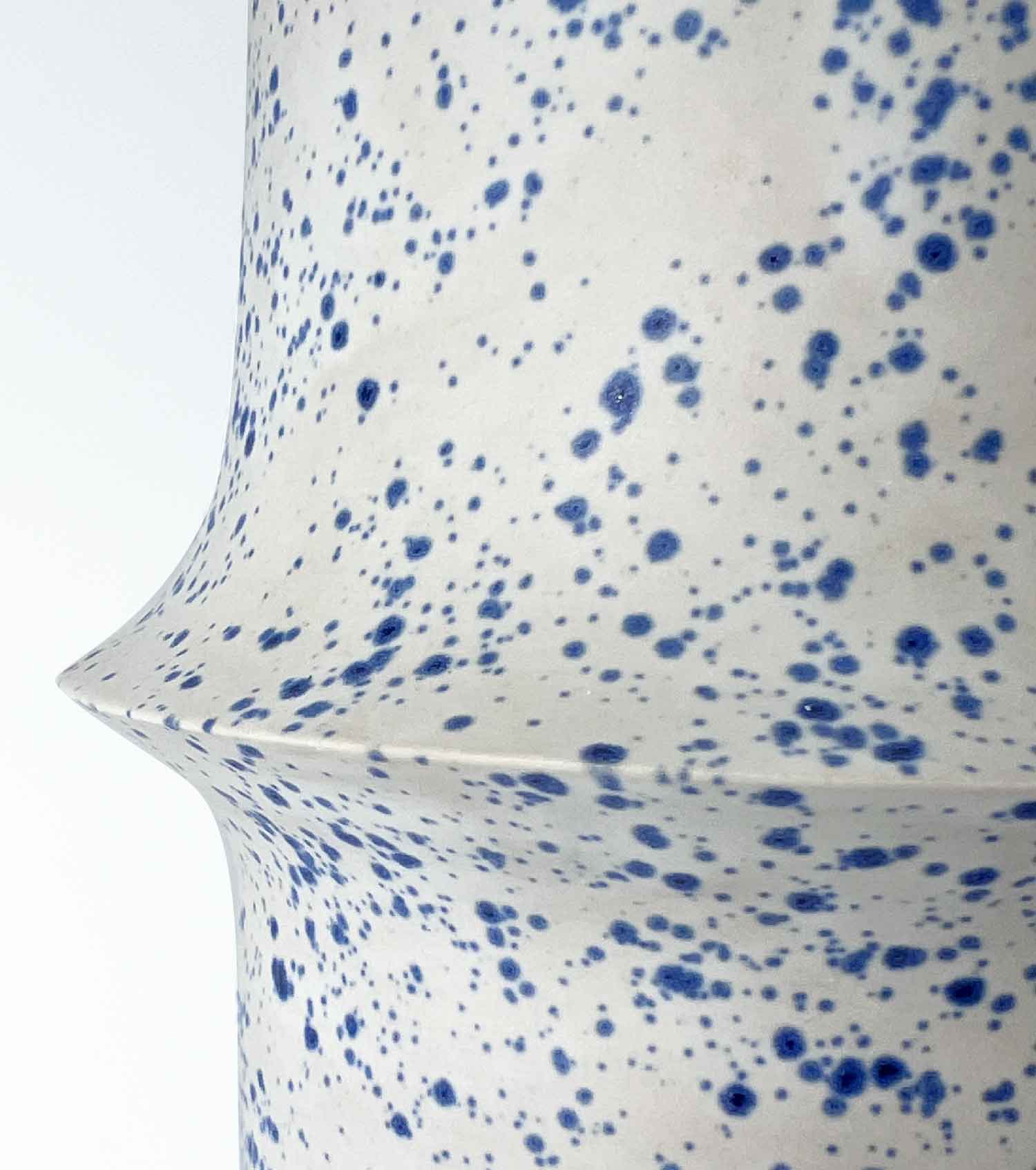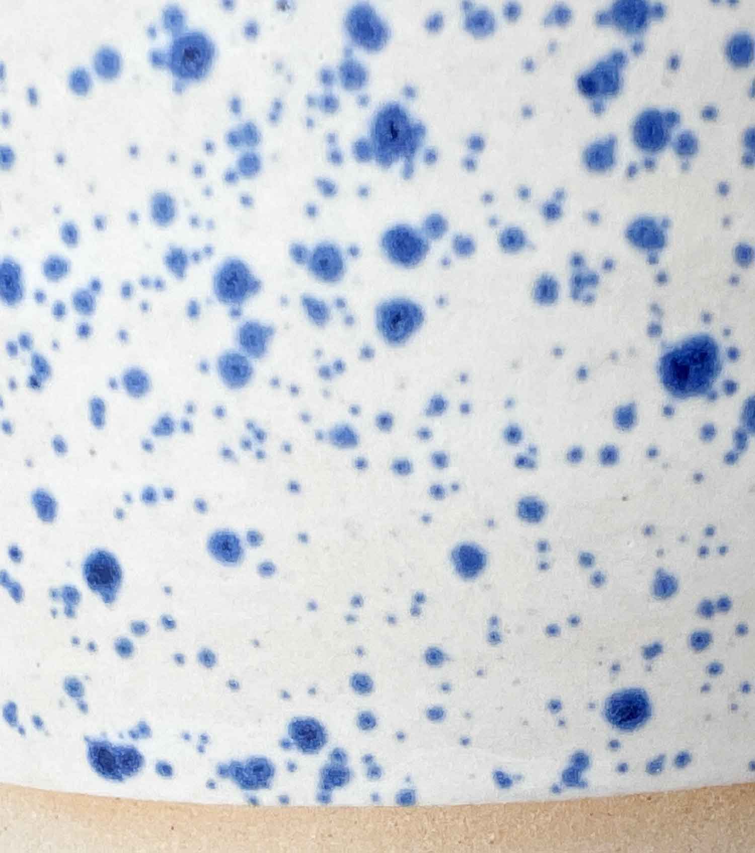 L’émail blanc mat, moucheté de bleu, apporte une texture douce qui accentue le jeu de lignes.