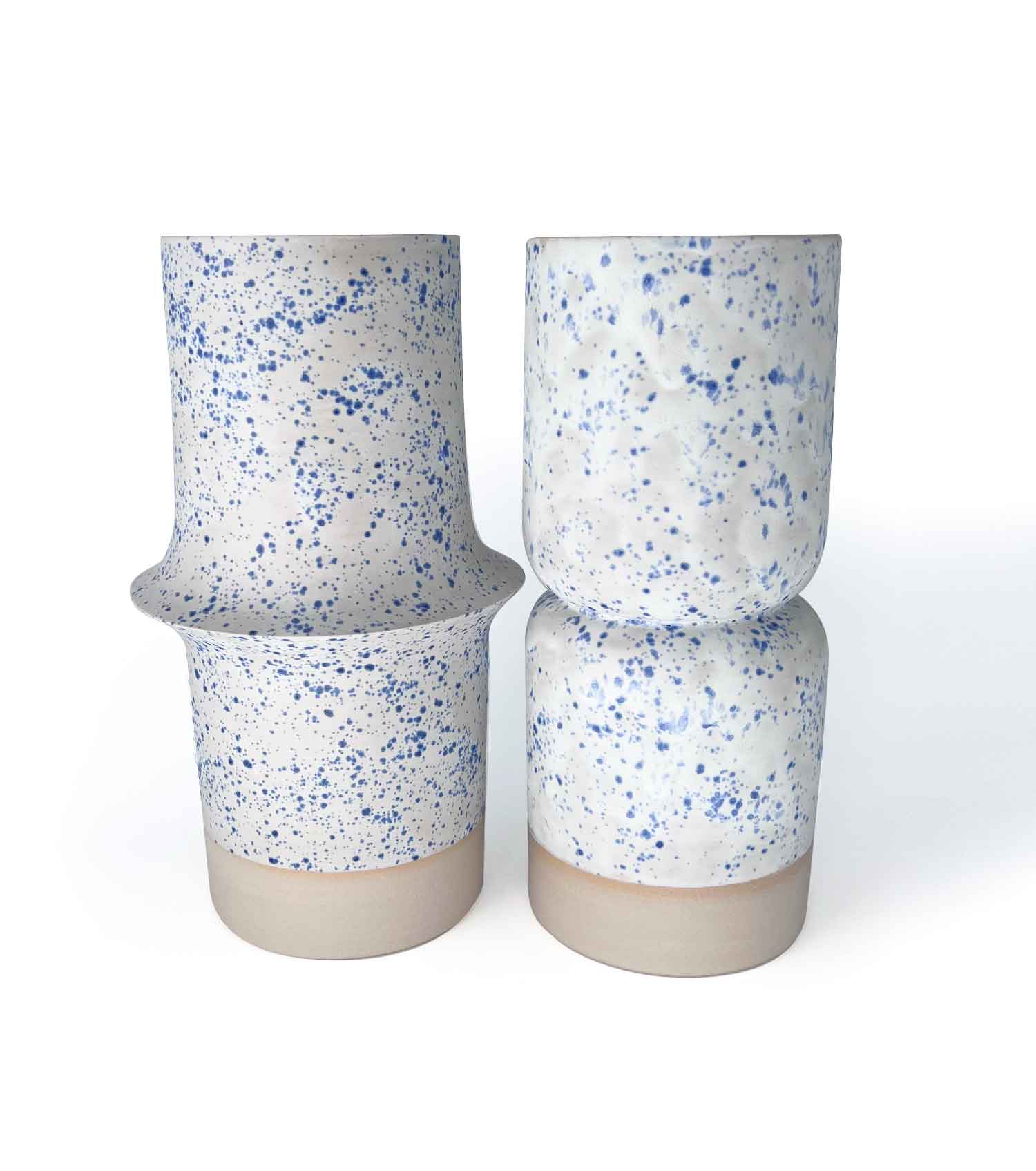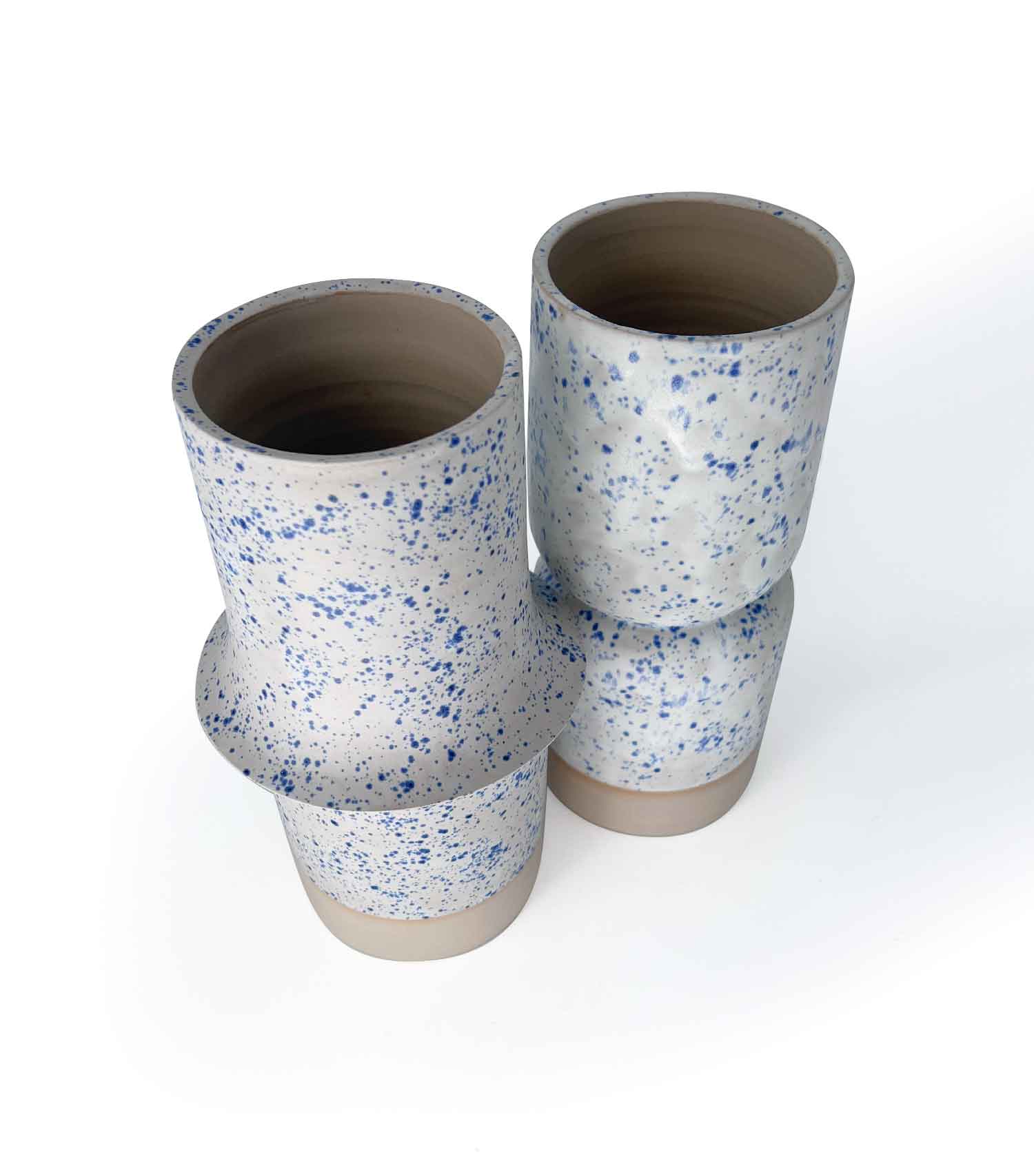 Ce duo de vases reprend une architecture commune marquée par un épaulement pointu. L’un s’ouvre vers l’extérieur, l’autre vers l’intérieur, permettant aux deux pièces de s’encastrer parfaitement et de créer un dialogue graphique.