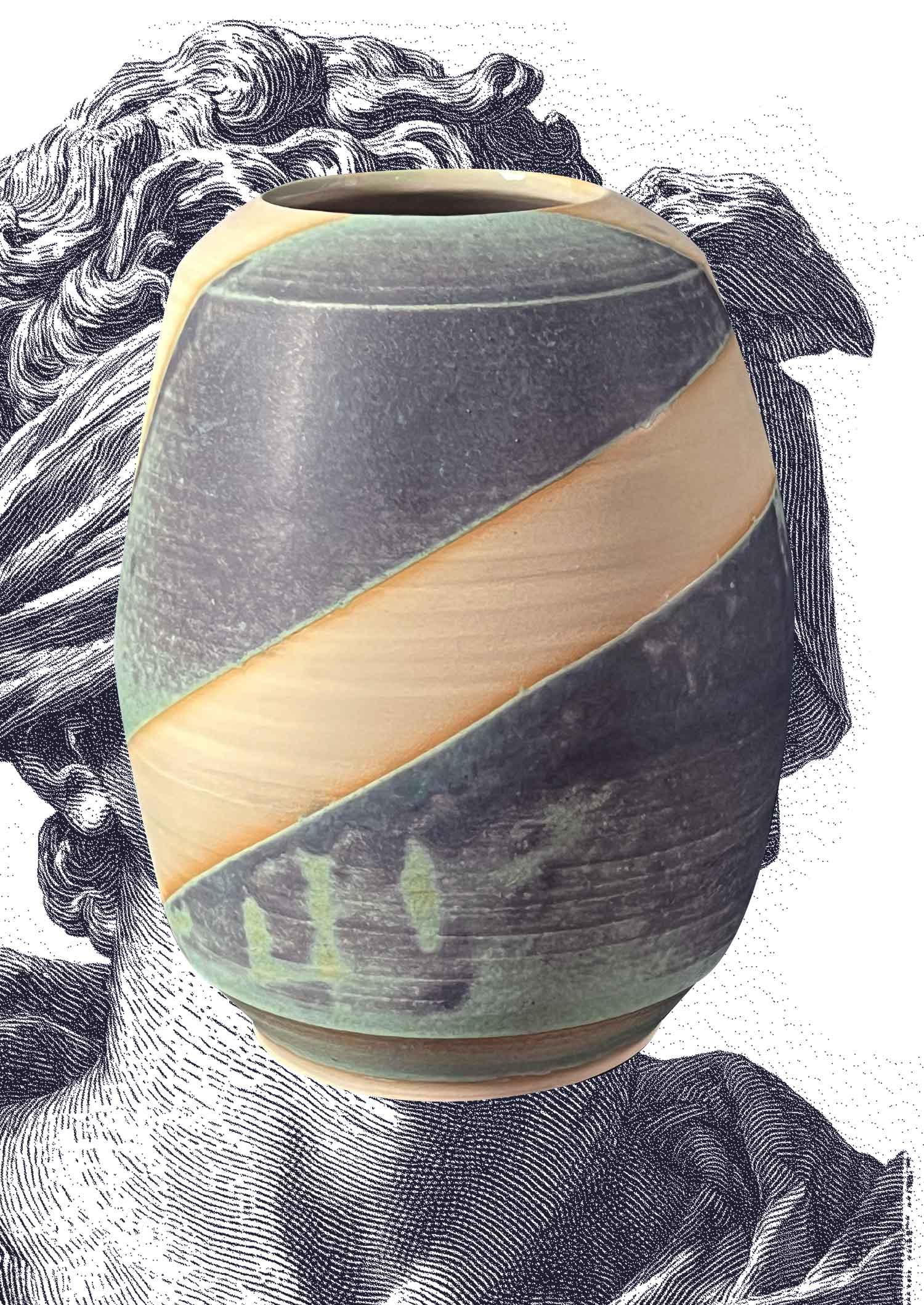 Vert tendre, terre nue, courbes amples : un grand vase bandé où la matière respire et s’affirme.