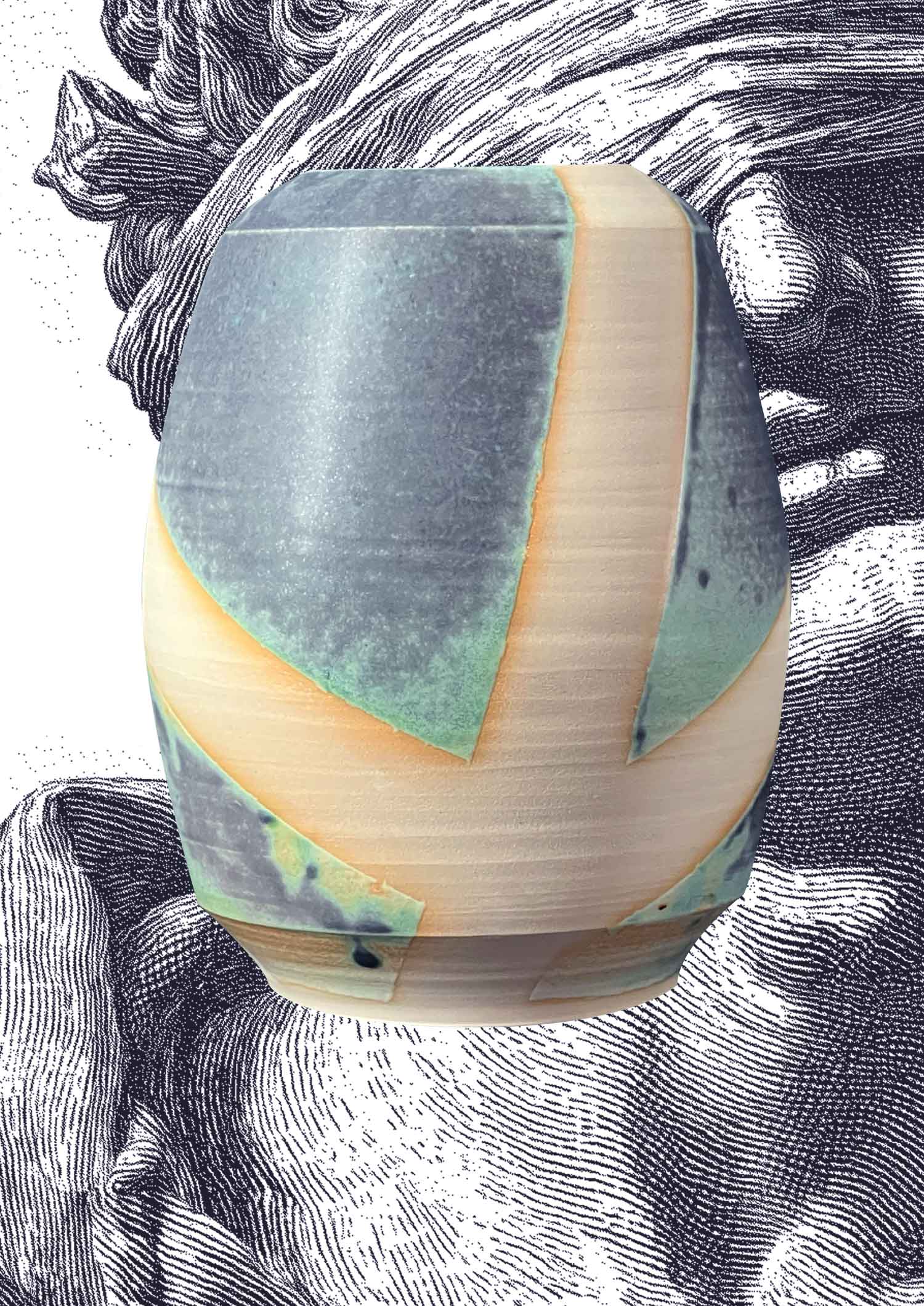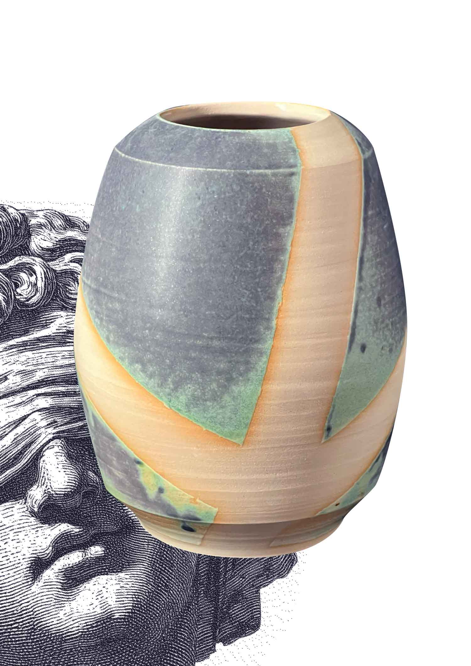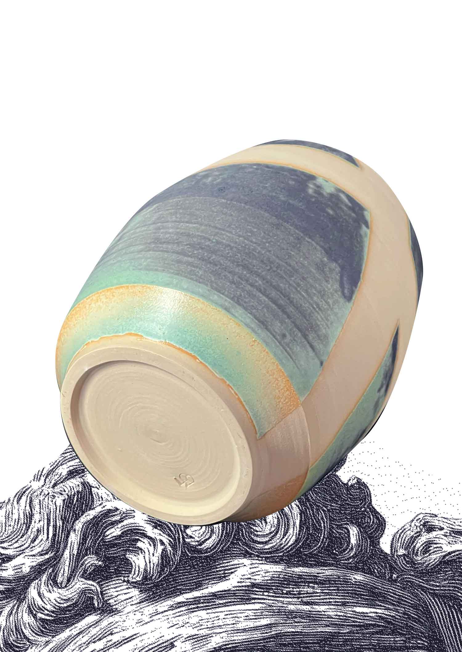 C’est un vase à la fois sculptural et méditatif, qui ne cherche pas à être parfait mais à être vrai : la terre respire, l’émail coule, le bandage relie.