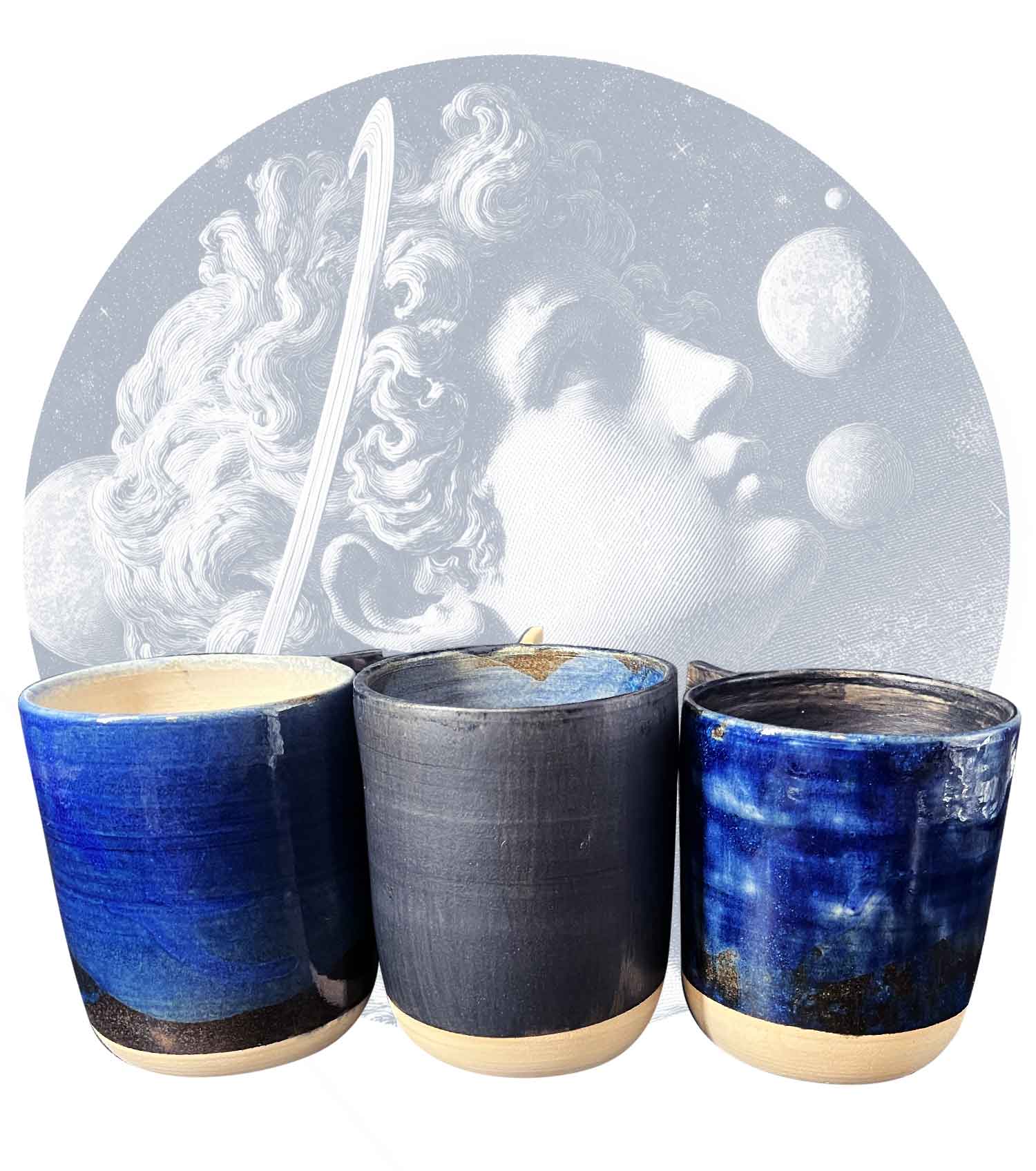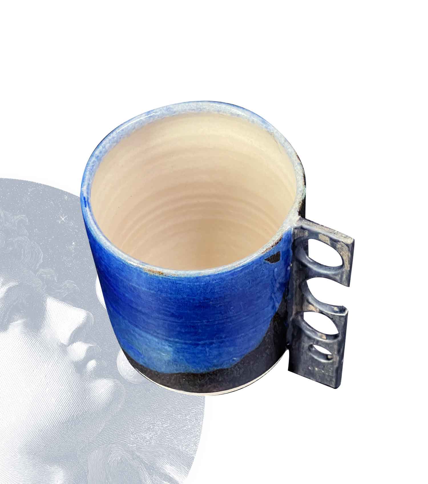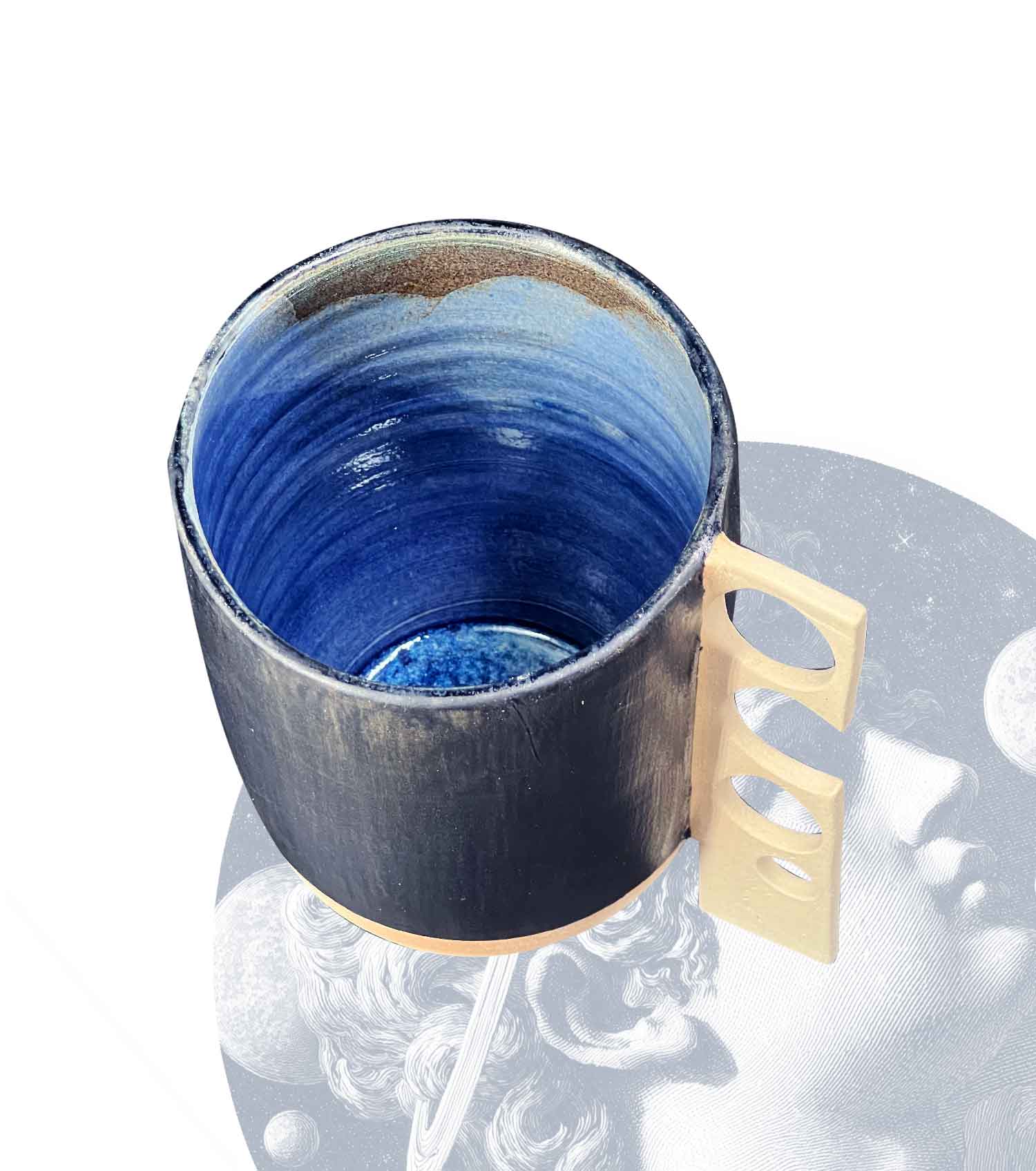 Jeu d’émaux (noir mat, bleu brillant) et terre à nu.