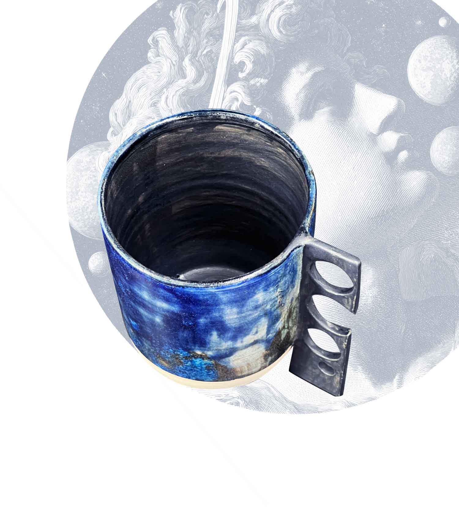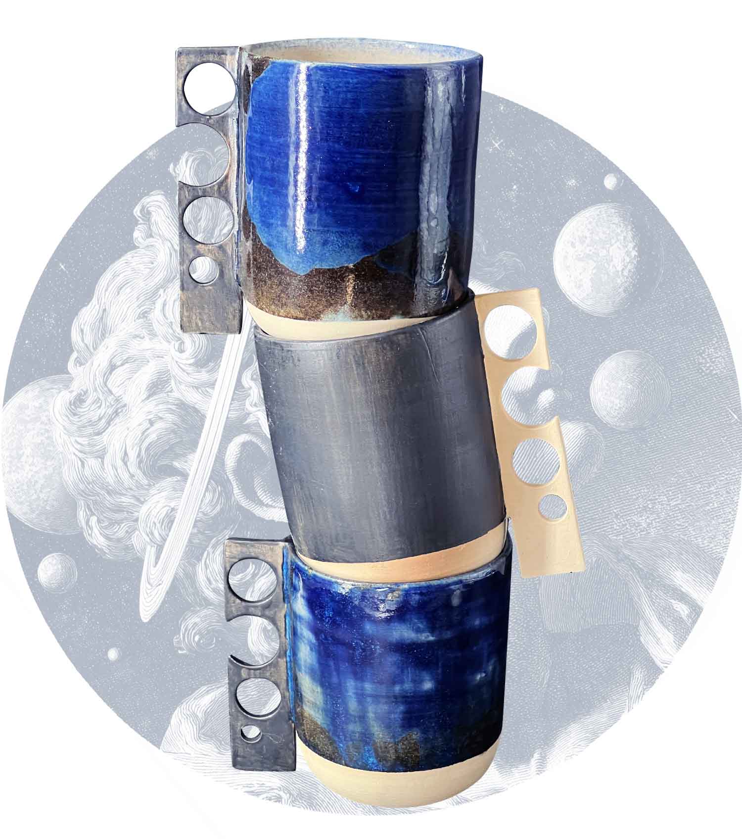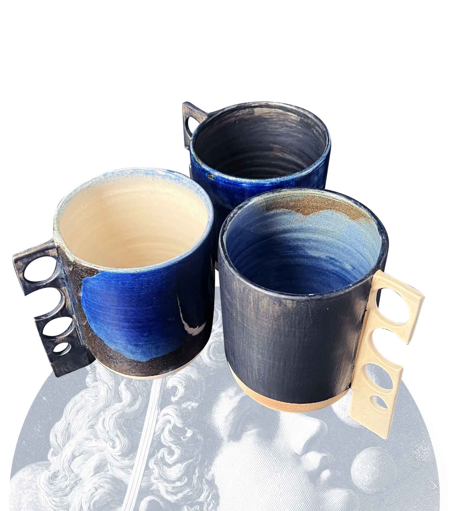 Jeu d’émaux (noir mat, bleu brillant) et terre à nu.