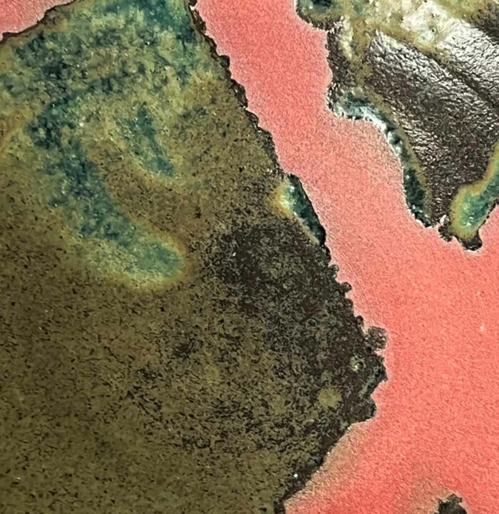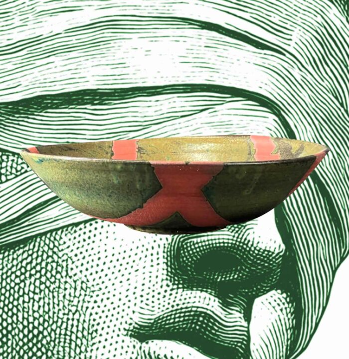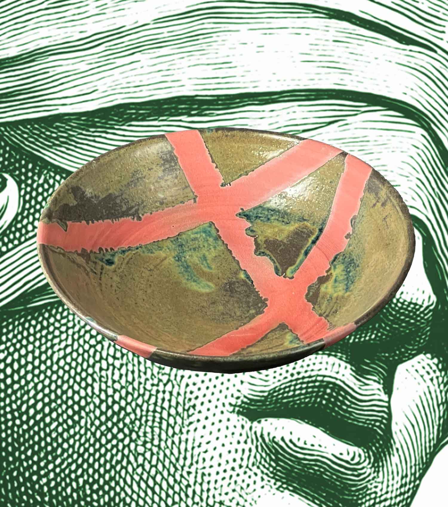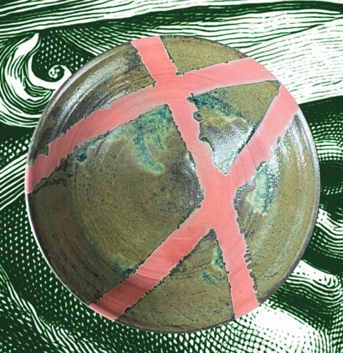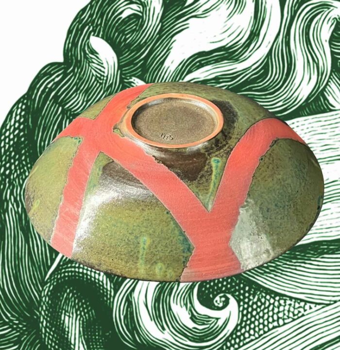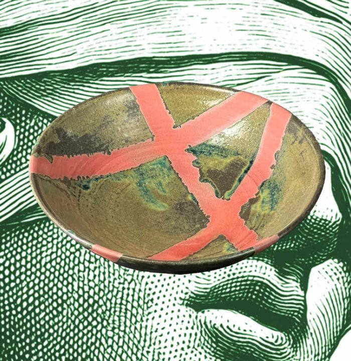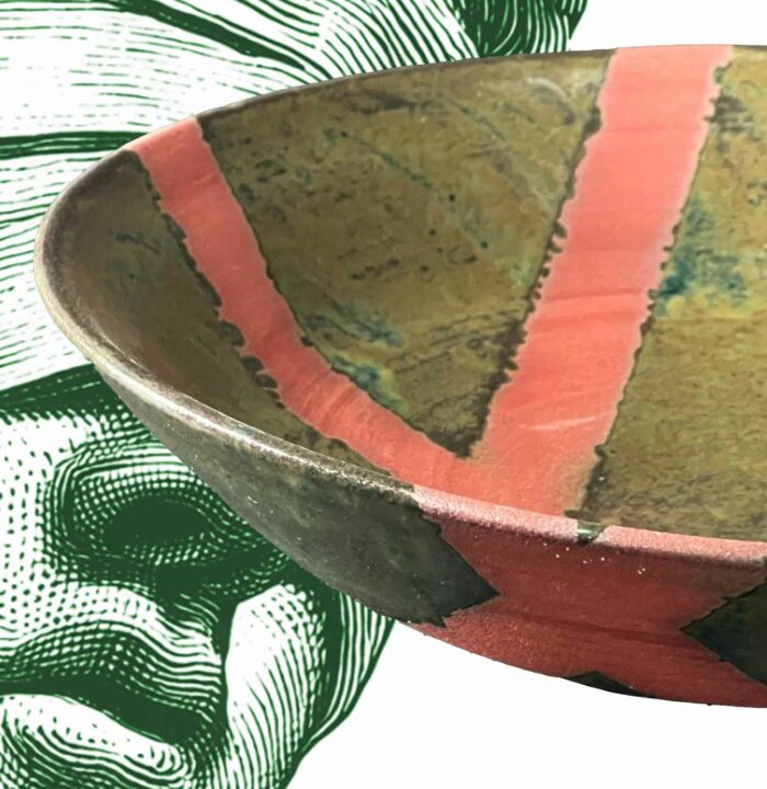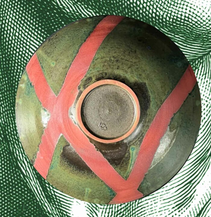 Issu de la même lignée de pièces “bandées”, ce saladier impose sa présence par ses proportions généreuses, un “bol plat” ample qui respire. Façonné en grès, il porte fièrement des bandes interrompant l’émail : des stries ou zones non émaillées laissent apparaître la terre brute, témoins du geste, de la matière à vif.