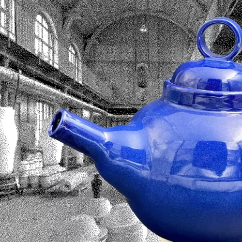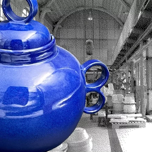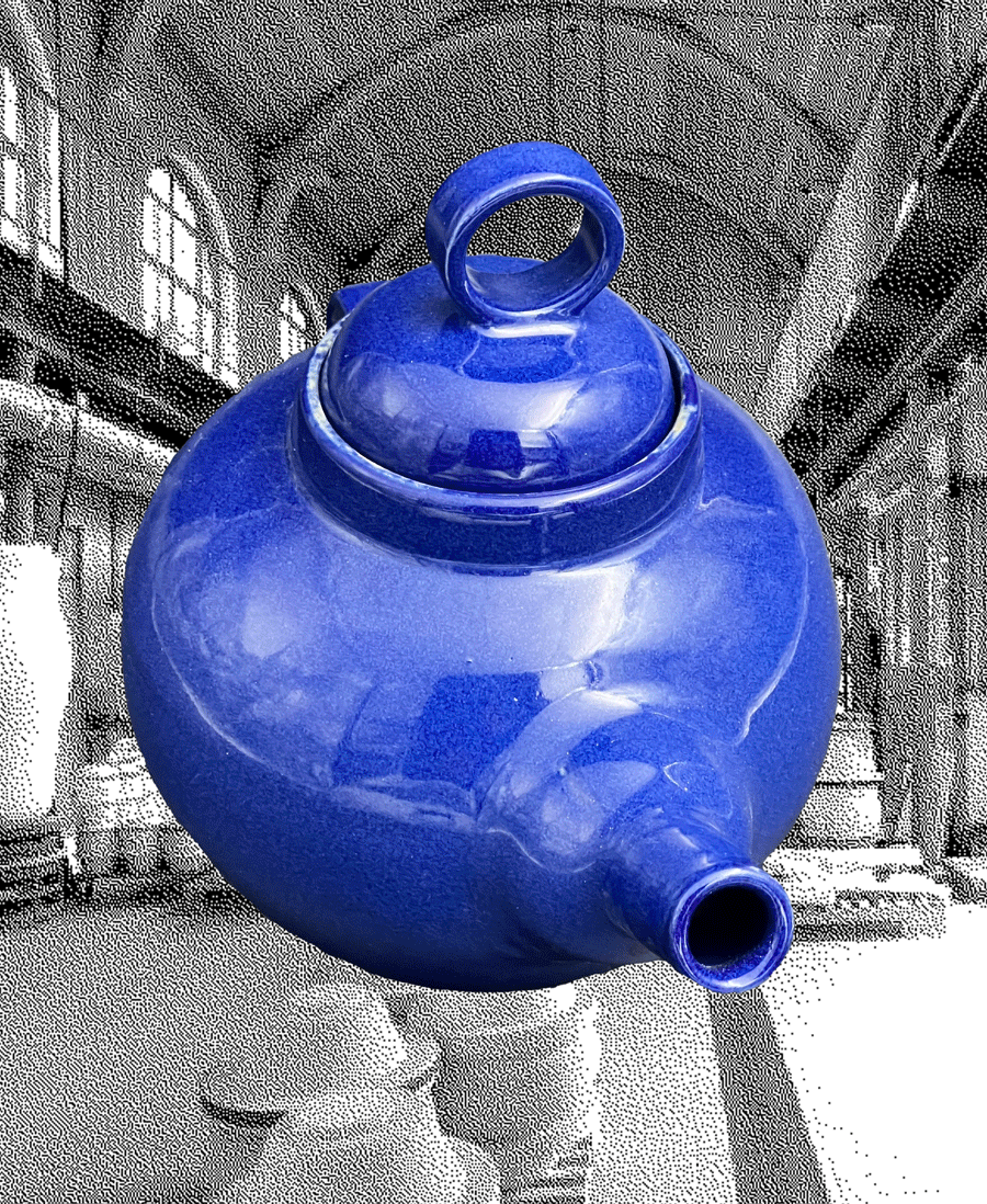 Une théière en Grès, émaillée en bleu de Sèvres, globulaire et émaillée d’un bleu cobalt intense, se distingue par son bec trapu et son couvercle surmonté d’une anse circulaire. Sa forme sobre met en valeur l’éclat et la profondeur de la couleur.