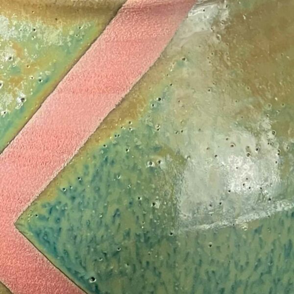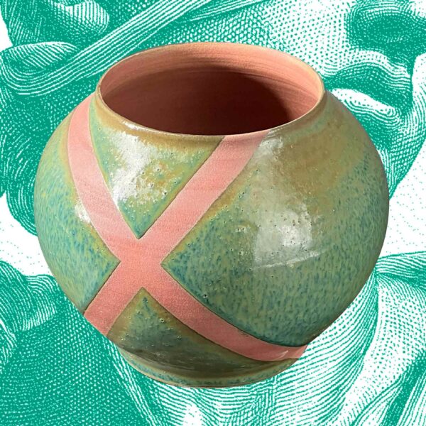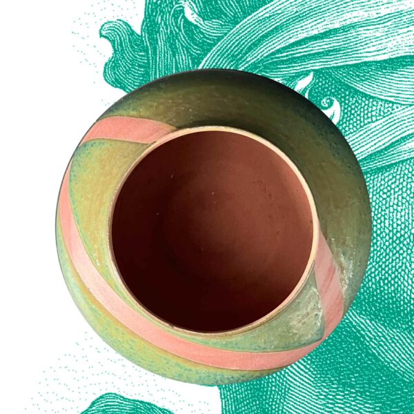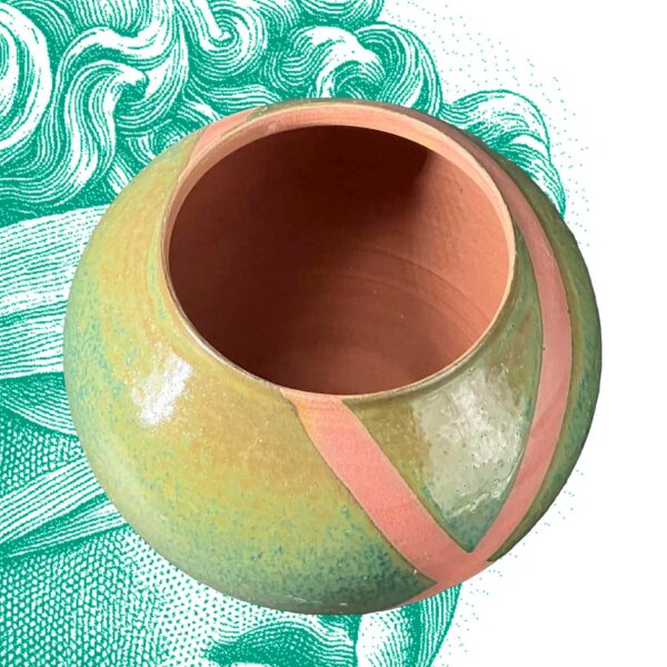 Façonné en grès rouge, sa surface est parcourue de bandes qui interrompent délicatement l’émail : des zones où la terre brute affleure.