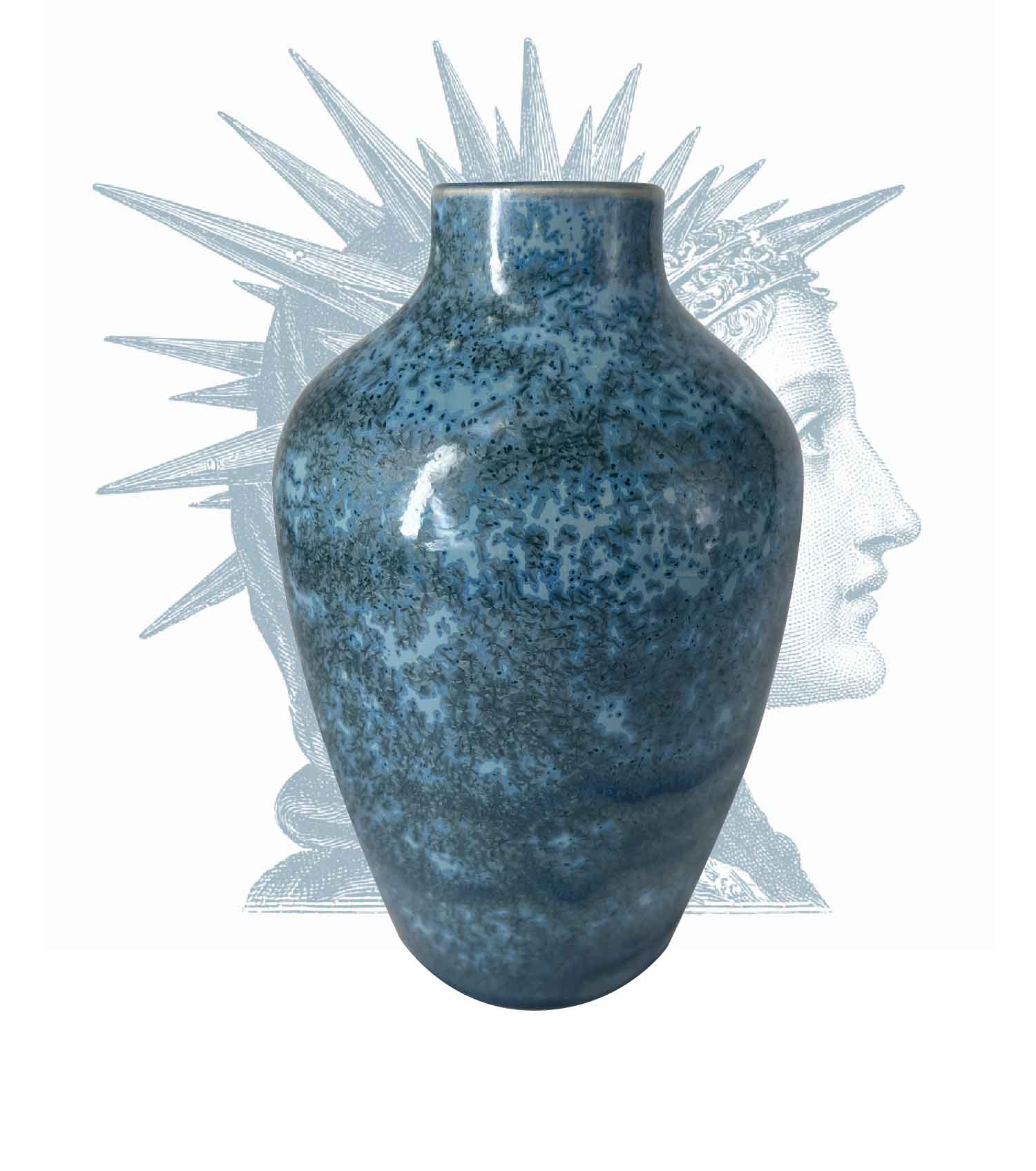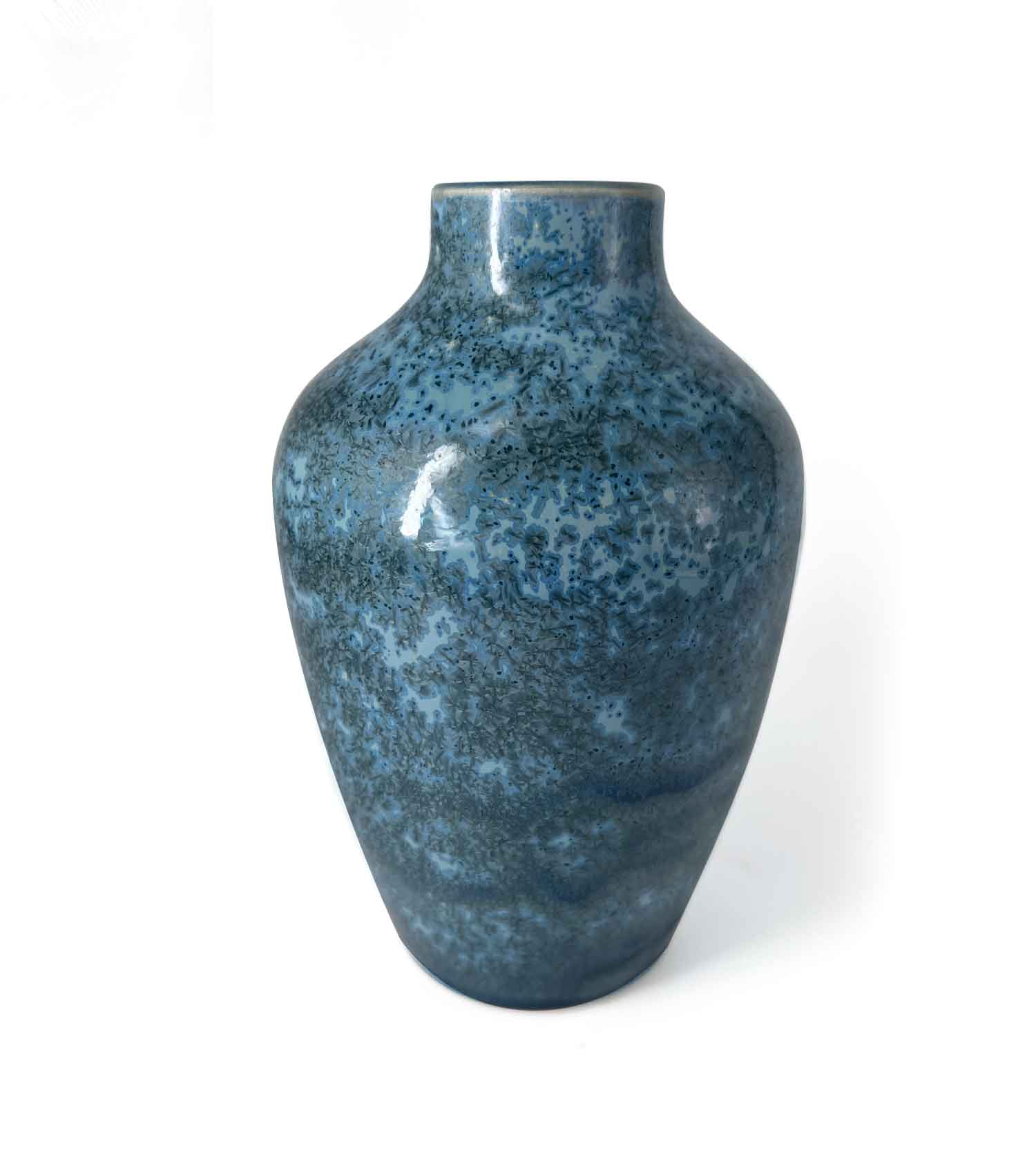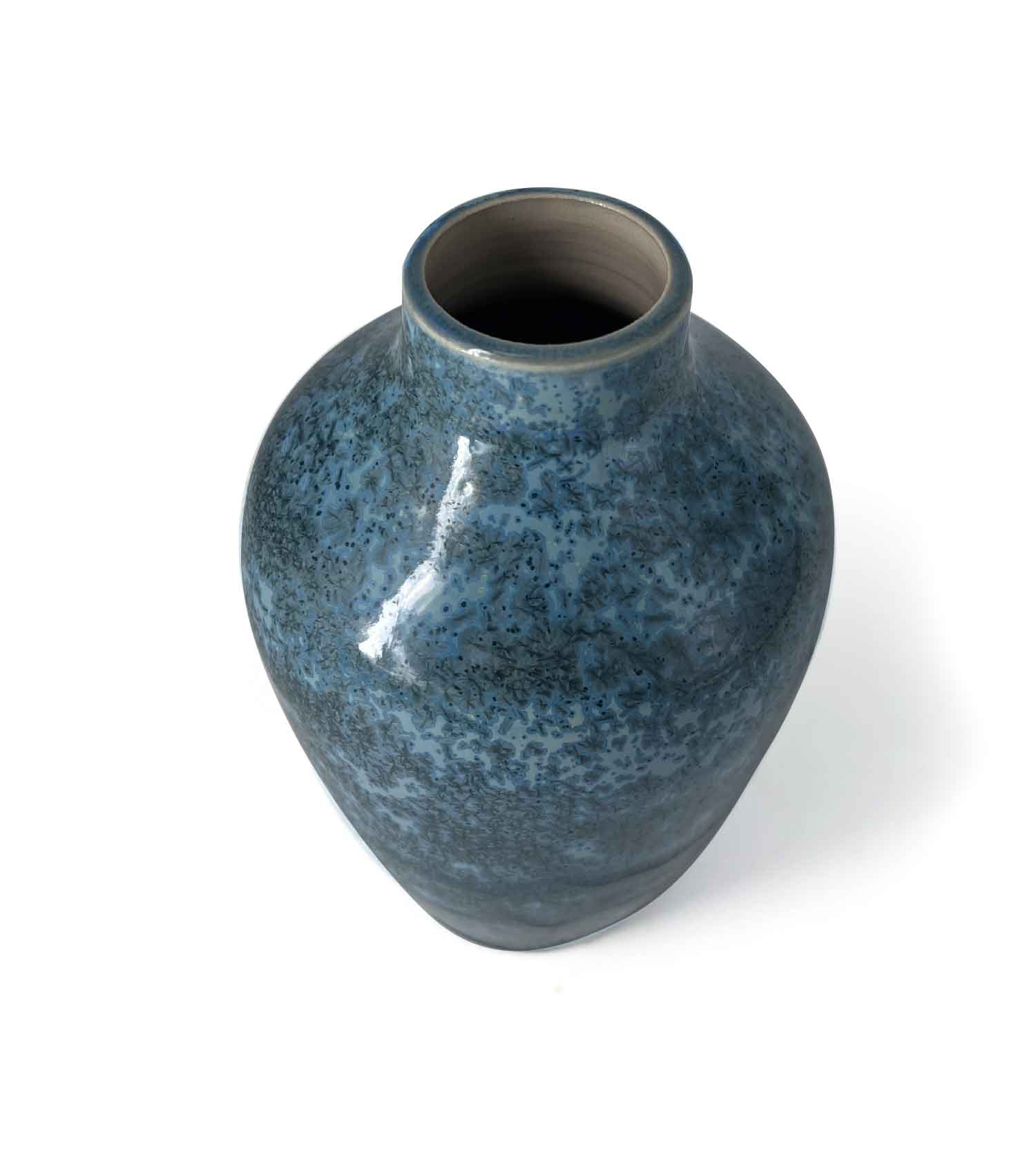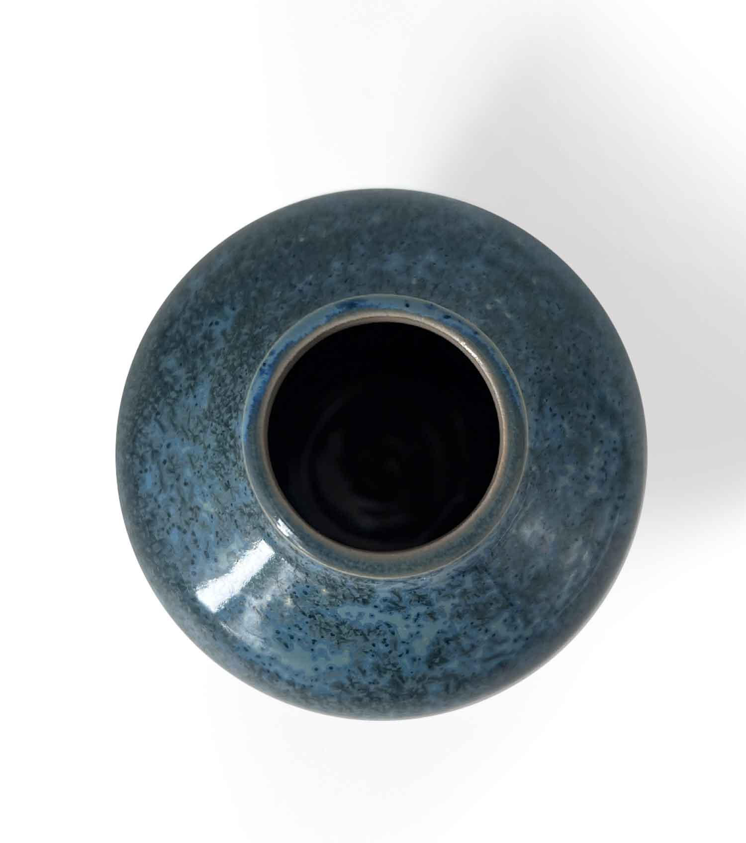Ce vase bouteille aux lignes douces est recouvert d’un émail bleu-vert intense animé de fines nucléations cristallines.