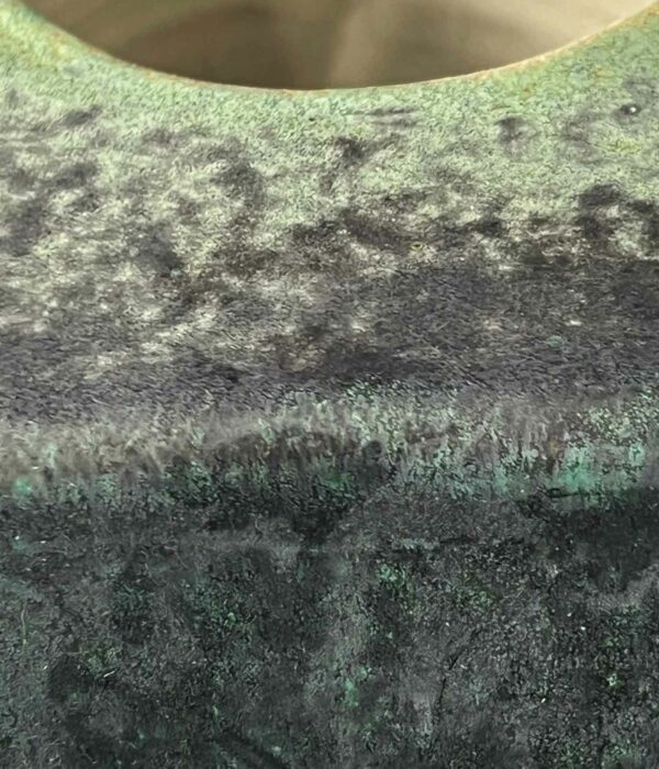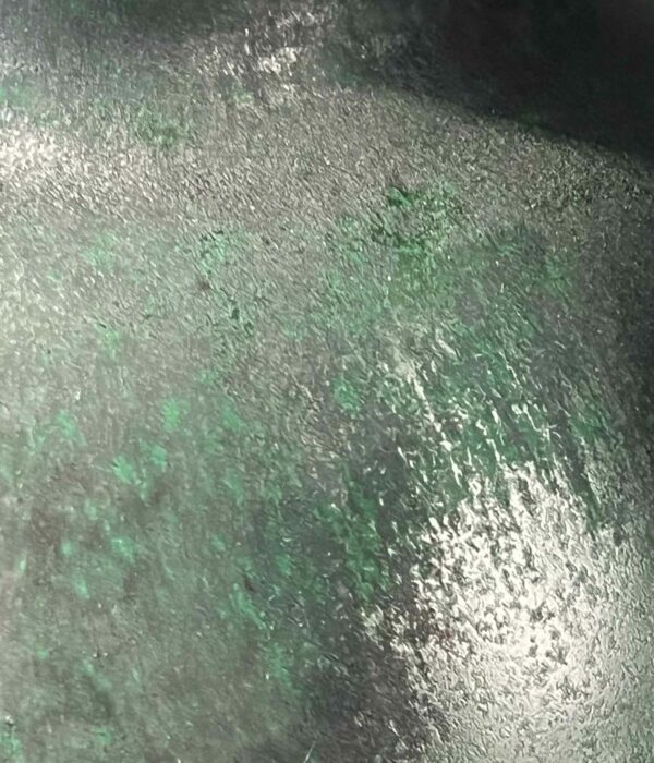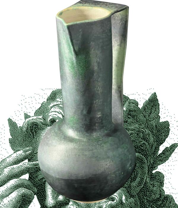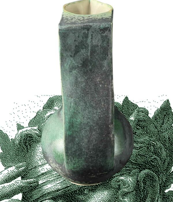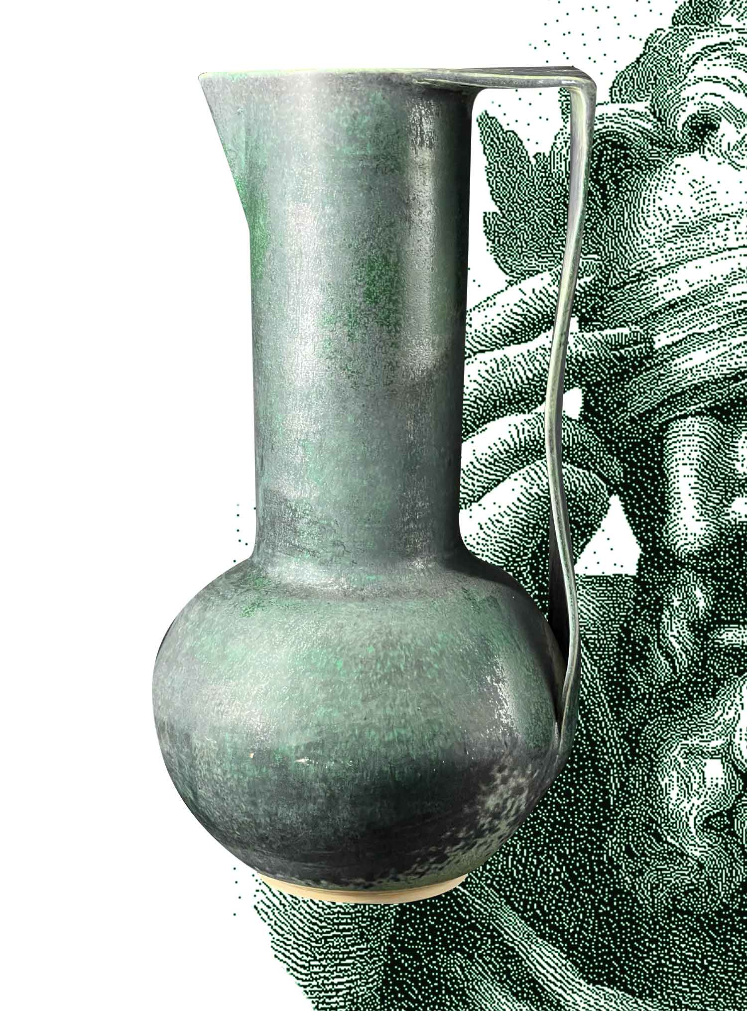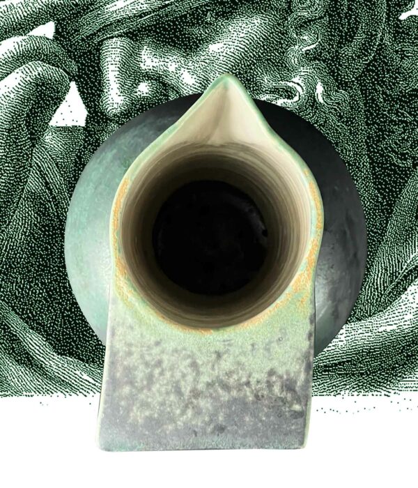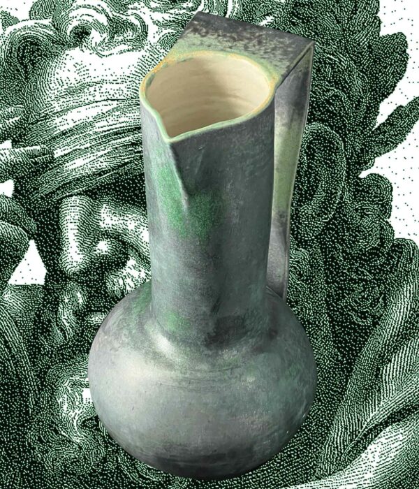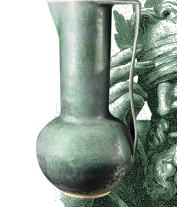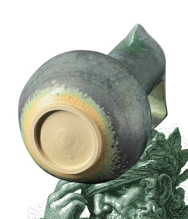 Un pichet qui s’élève comme un monument : base ronde, col très haut, silhouette élancée. Sa teinte vert émeraude oscille entre mat profond et éclats brillants.