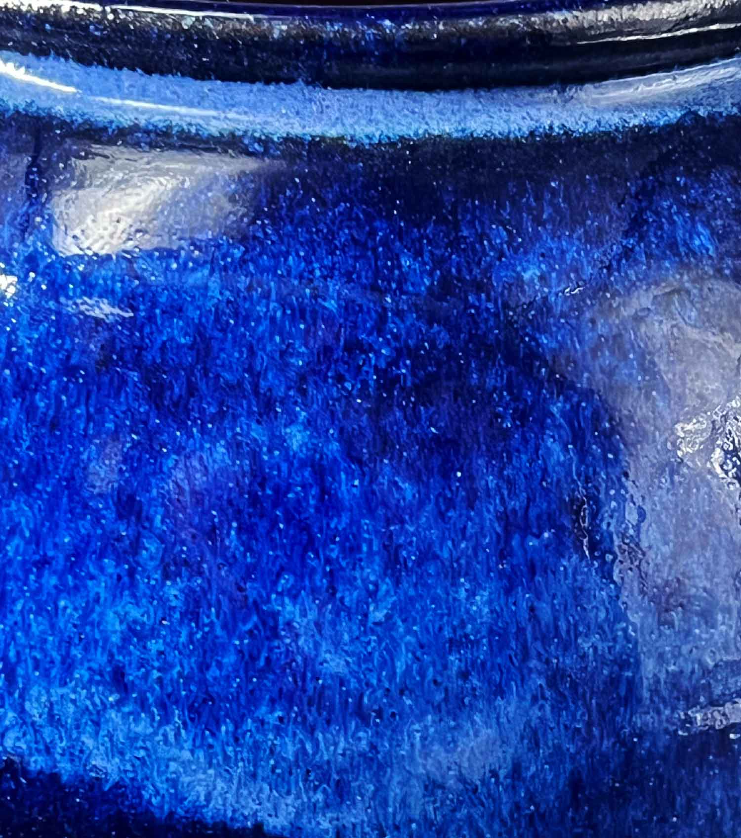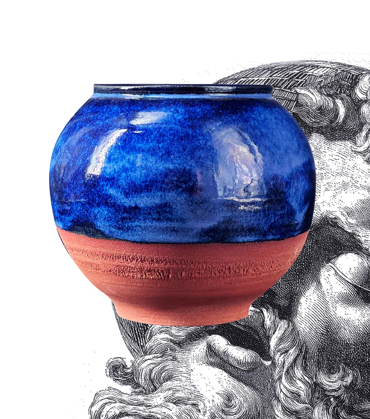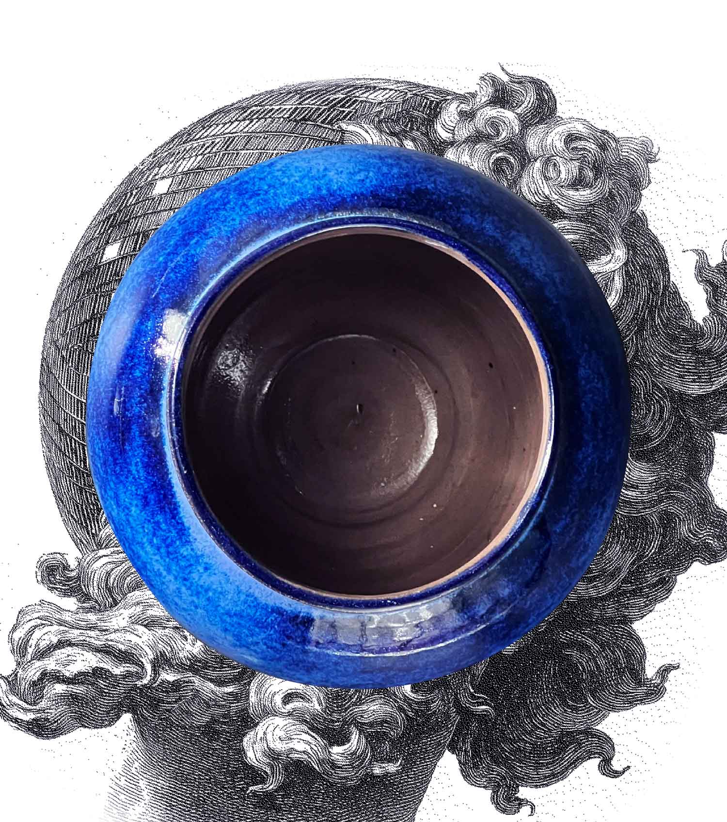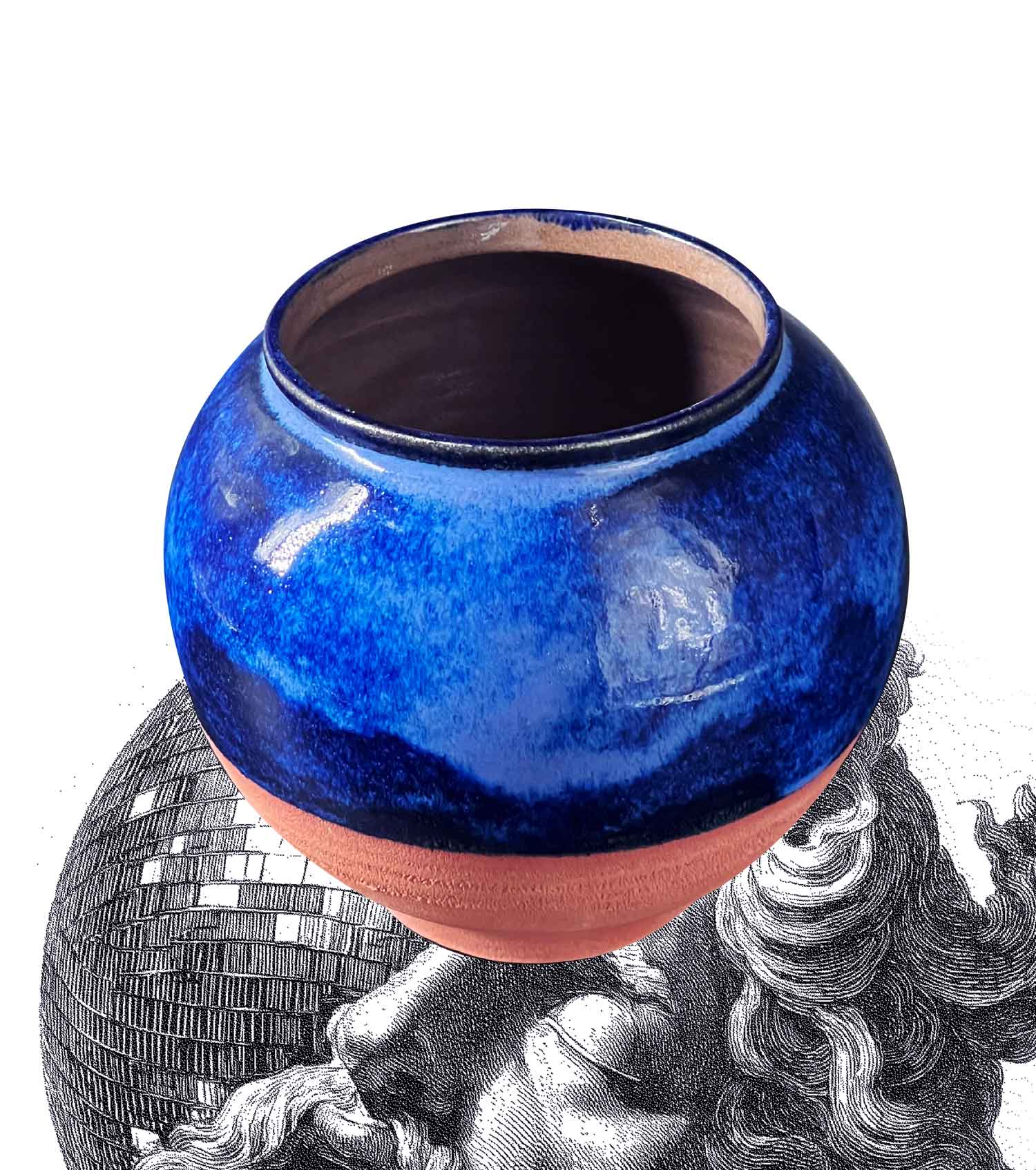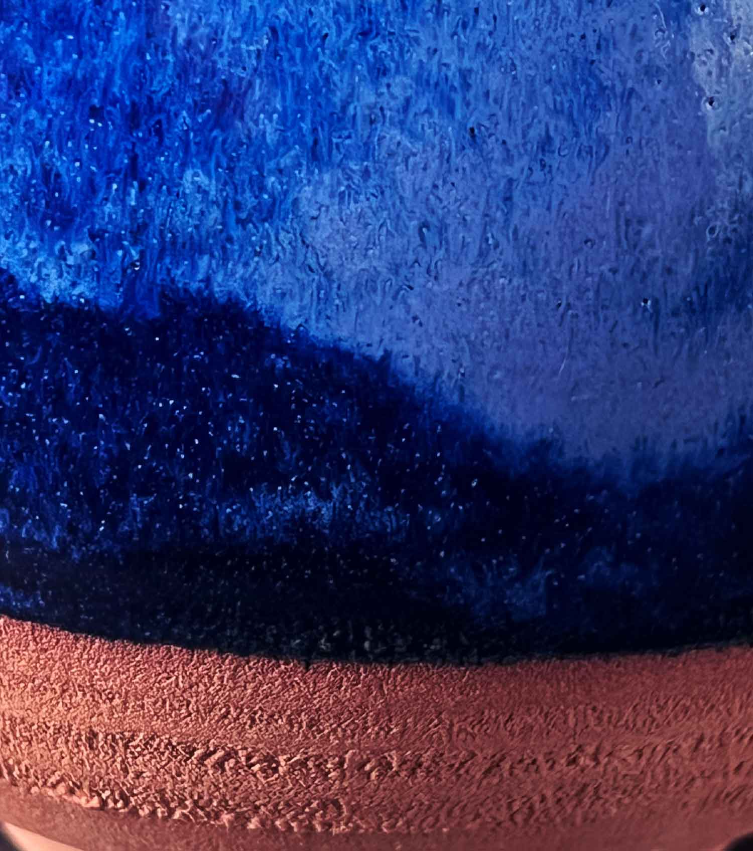 Le Vase Rond des Abysses arbore une forme ronde, sur ses trois quarts de surface émerge un effet de mer saisissant : émail bleu profond, vagues de reflets tumultueux.